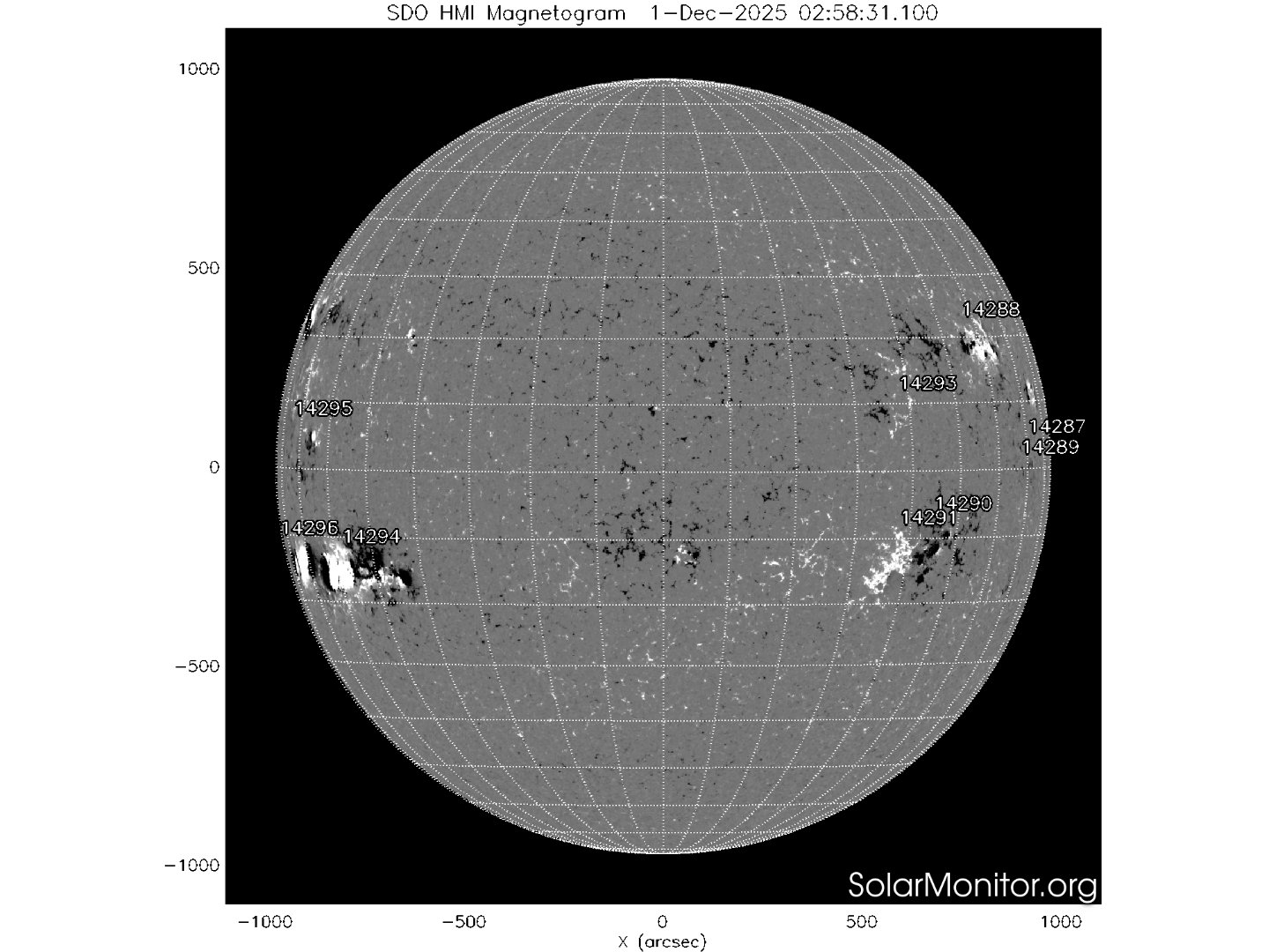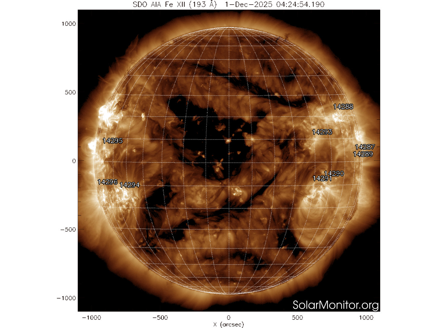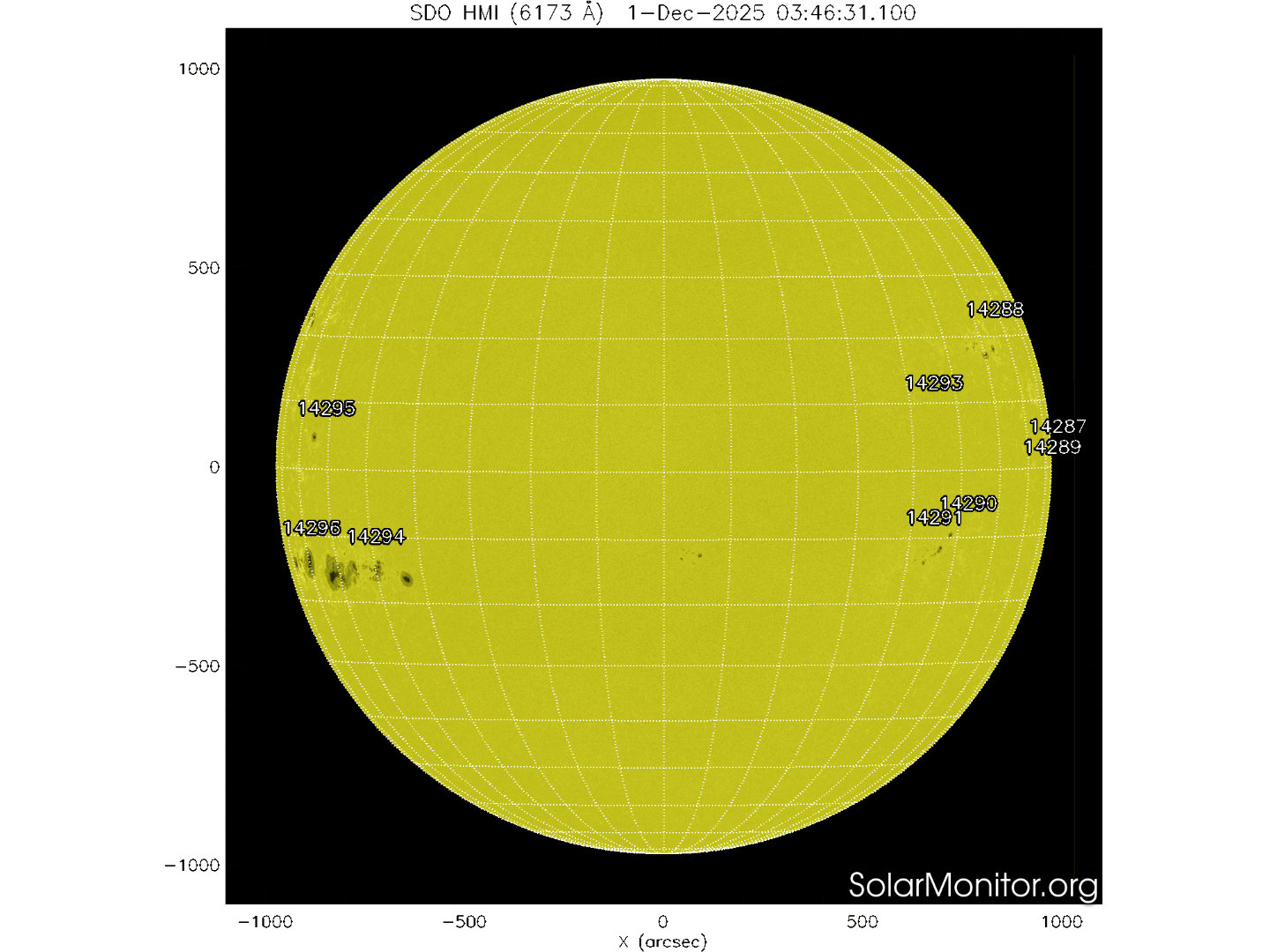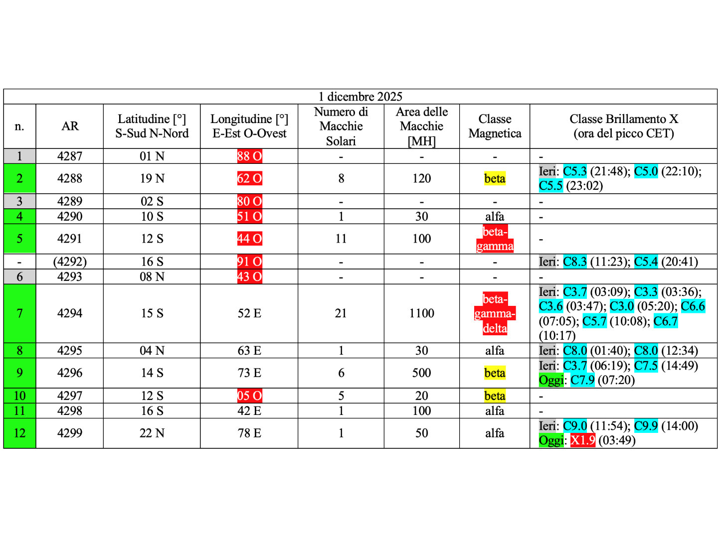 Dodici regioni attive sono presenti in fotosfera oggi 01 dicembre 2025, di cui 9 con macchie solari e 3 prive di macchie.