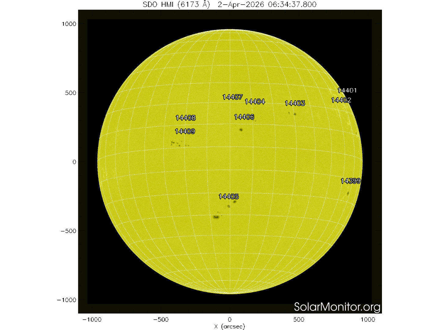 Dieci regioni attive sono presenti in fotosfera oggi 02 aprile 2026, tutte con macchie solari.