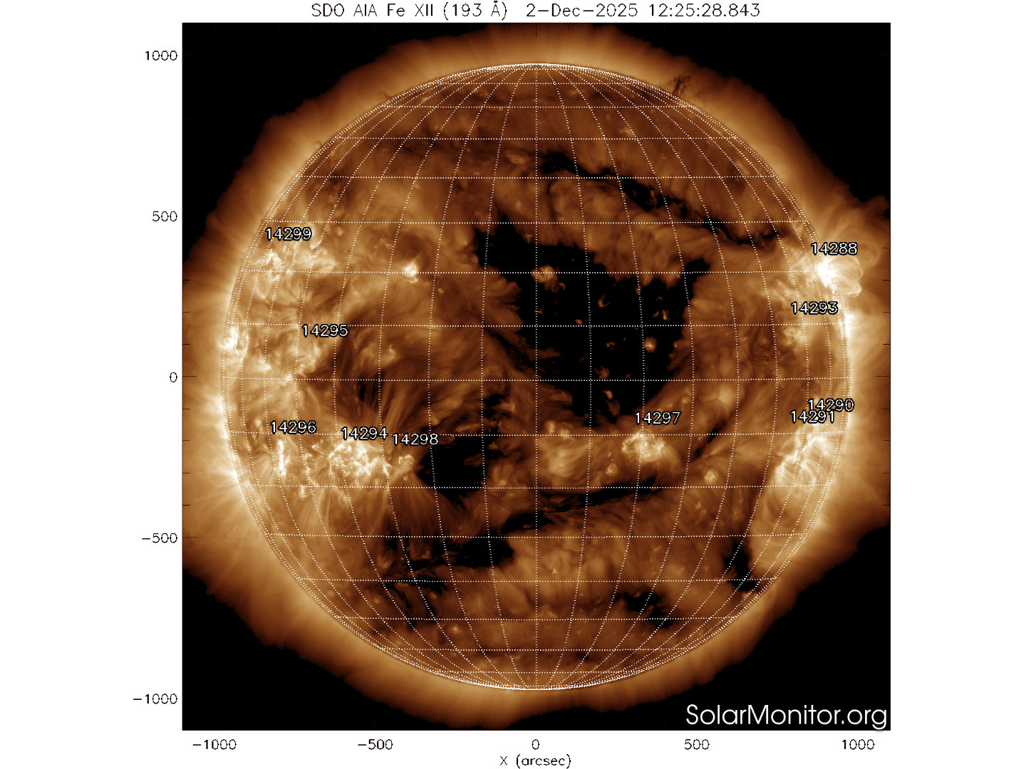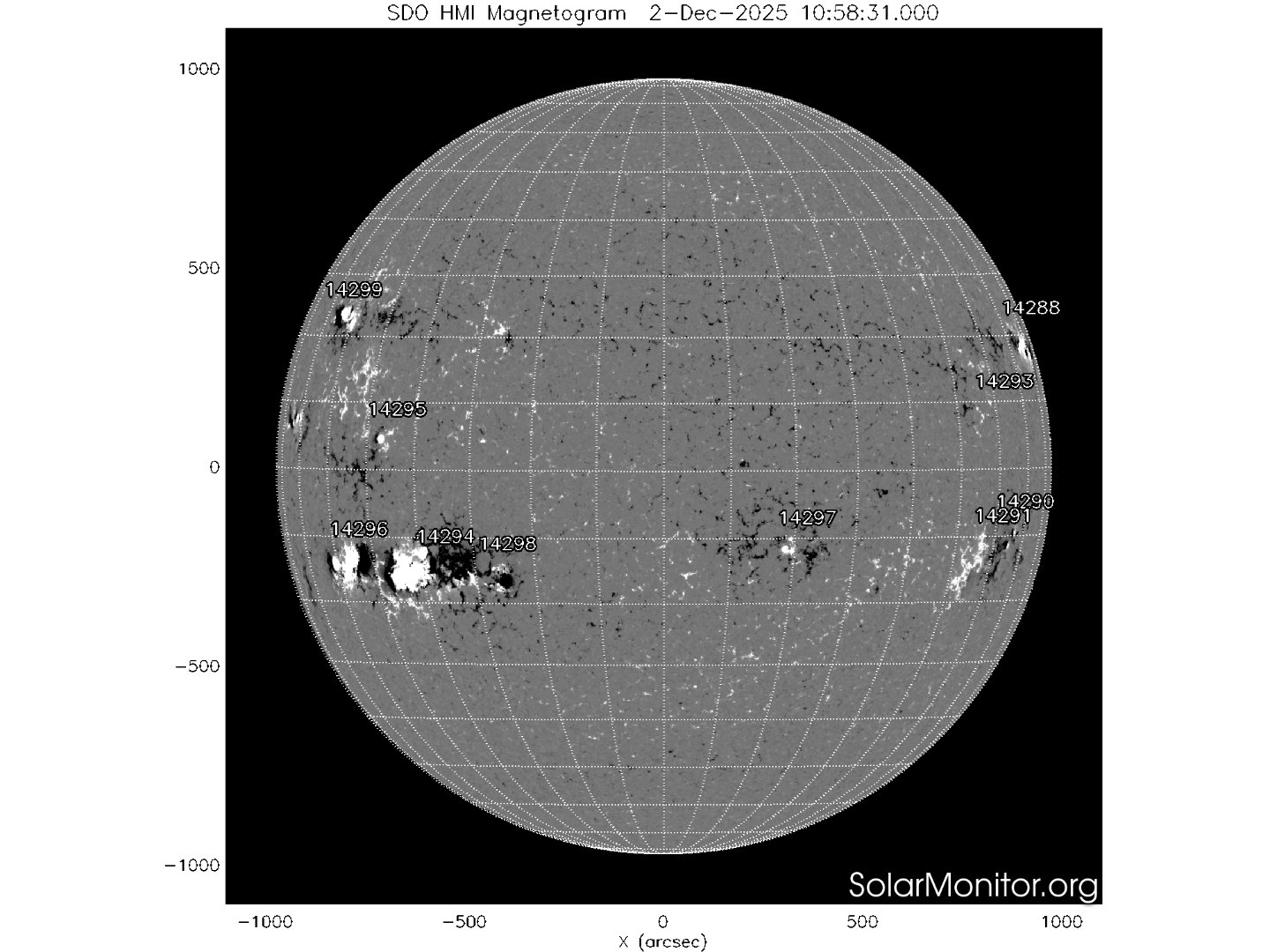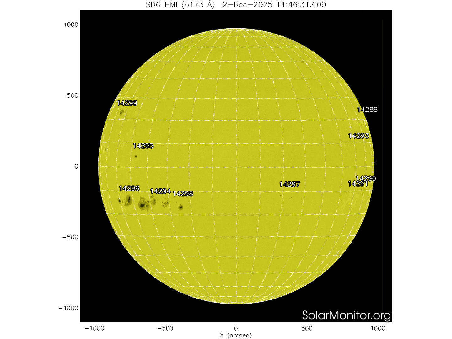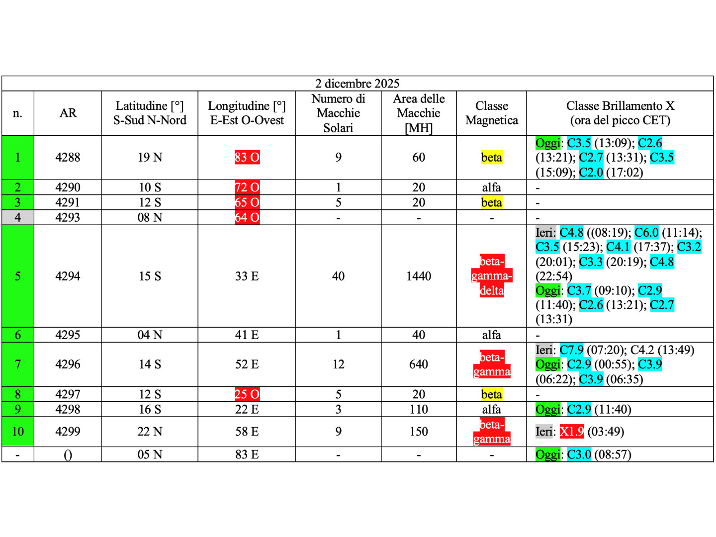 Dieci regioni attive sono presenti in fotosfera oggi 02 dicembre 2025, di cui 9 con macchie solari e 1 priva di macchie.