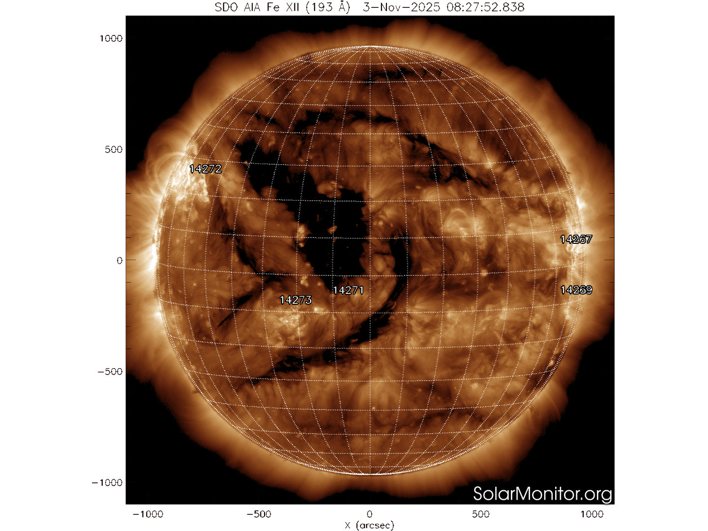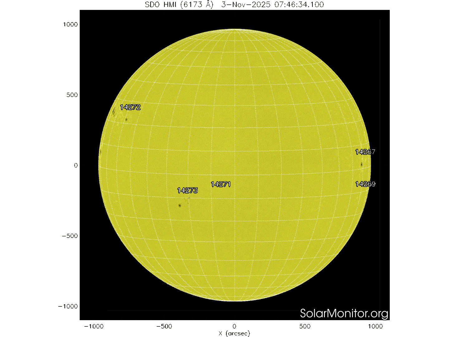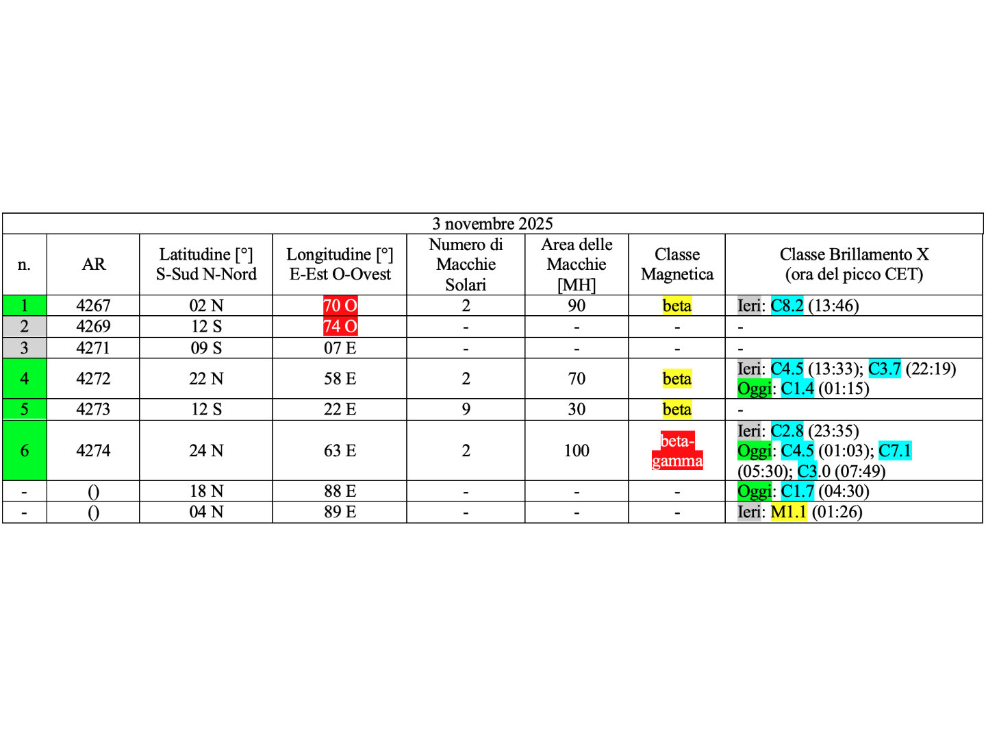 Sei regioni attive sono presenti in fotosfera oggi 03 novembre 2025, di cui 4 con macchie solari e 2 prive di macchie.