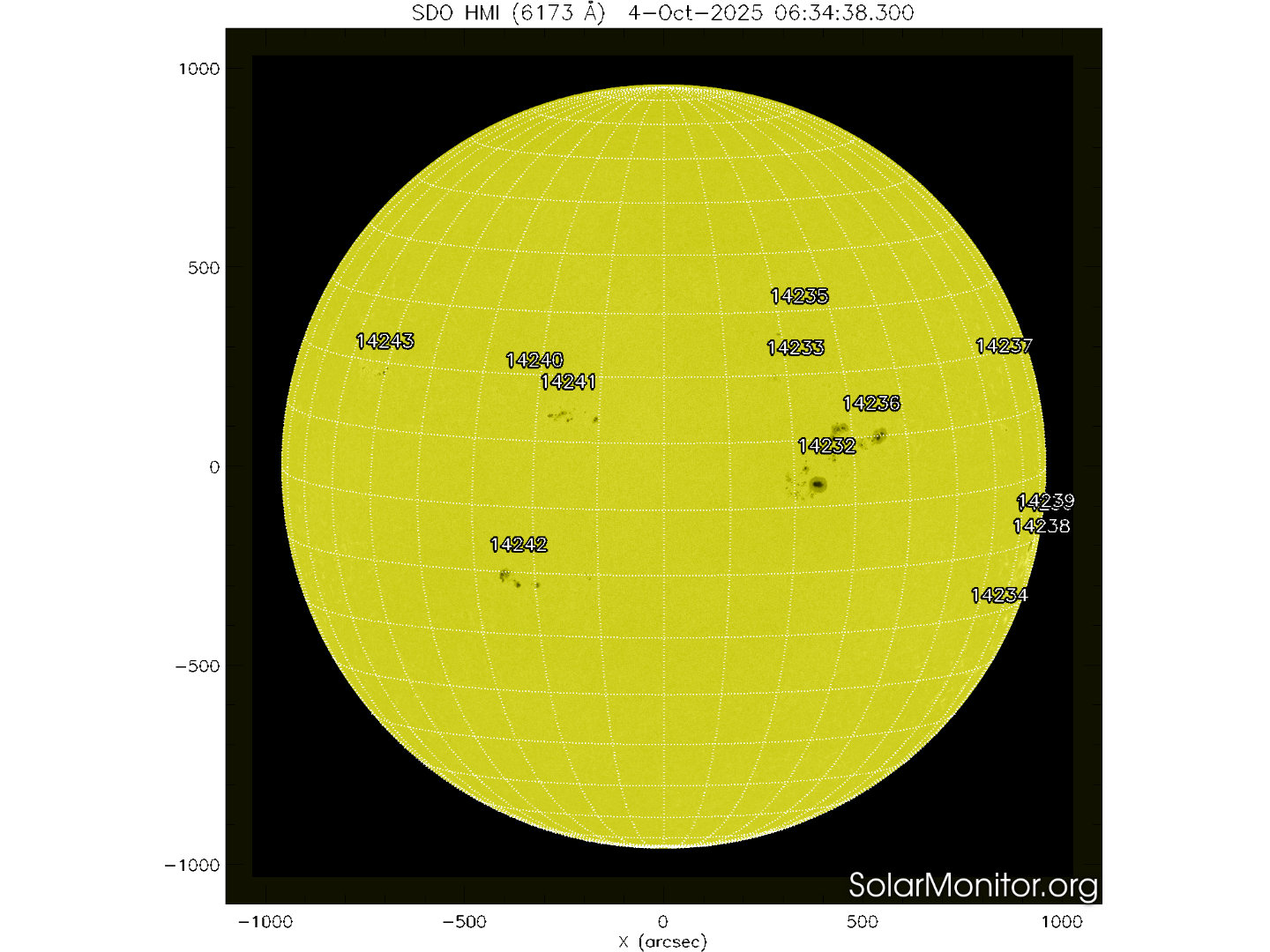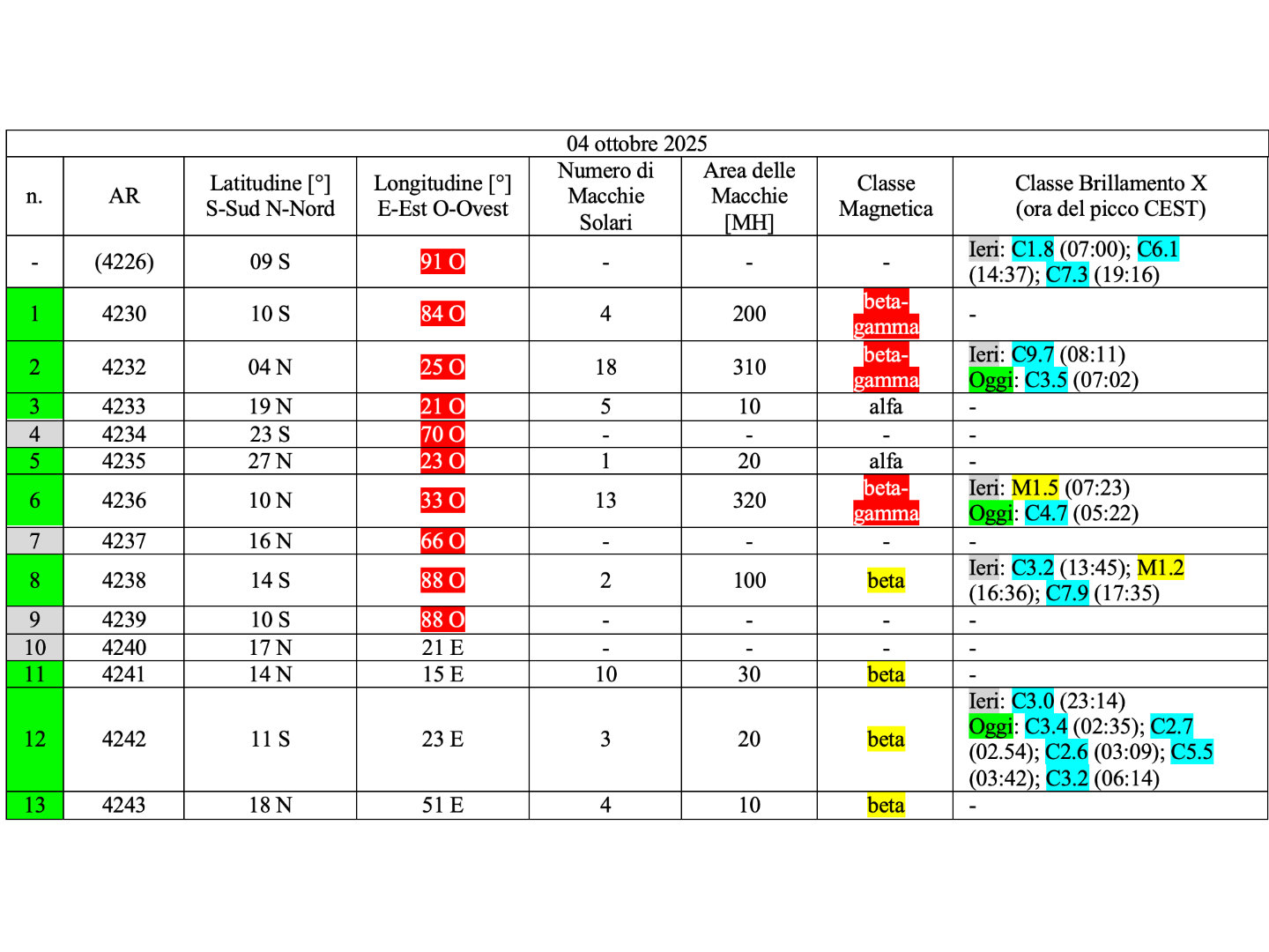 Tredici regioni attive sono presenti in fotosfera oggi 04 ottobre 2025, di cui 9 con macchie solari e 4 prive di macchie.
