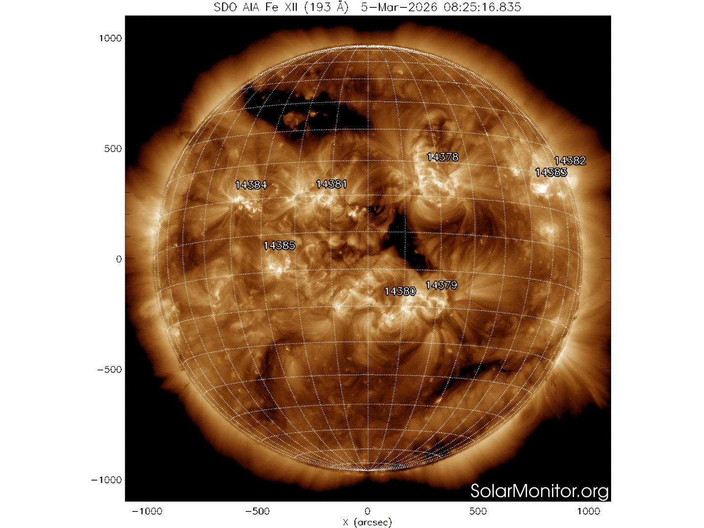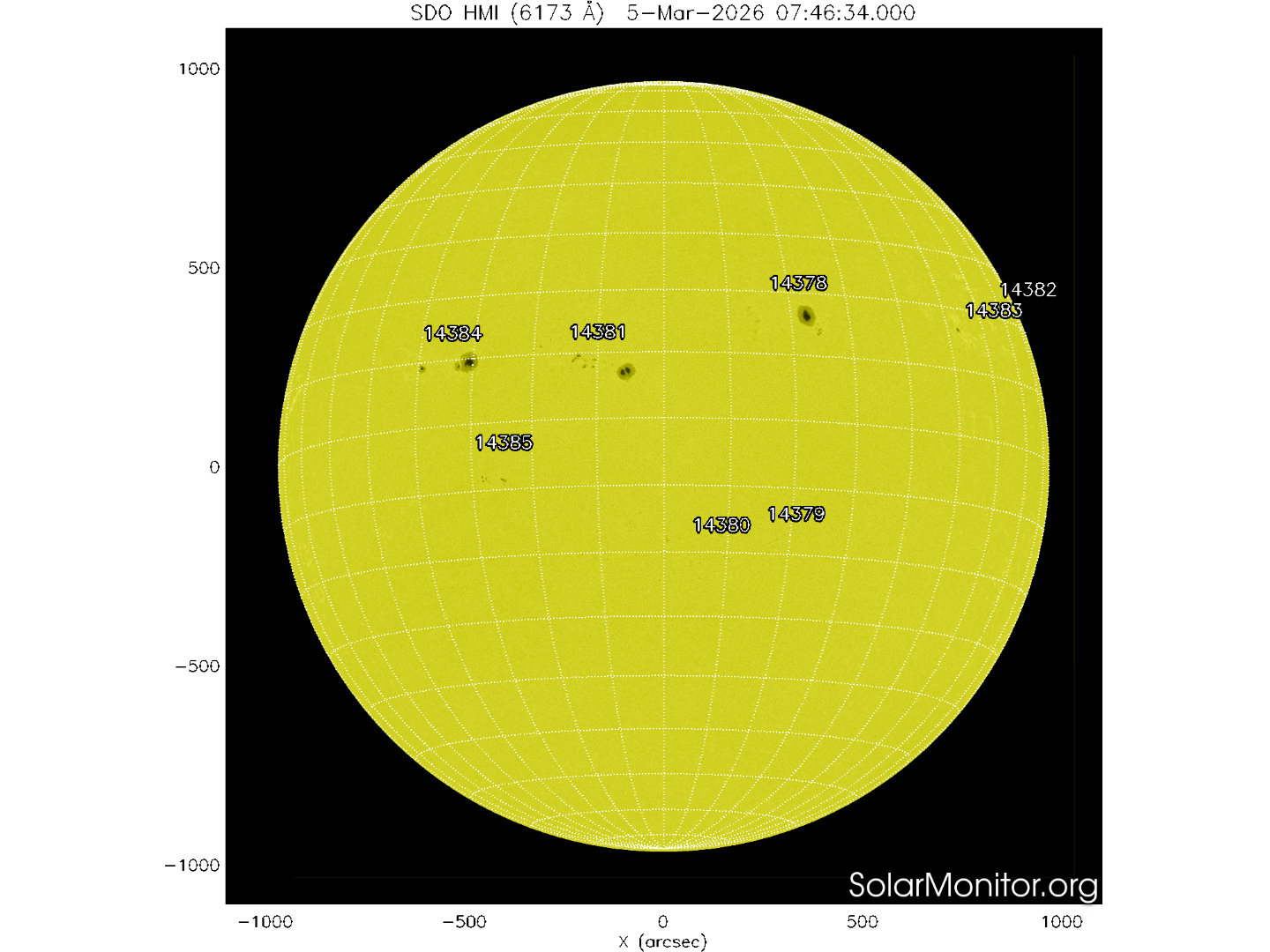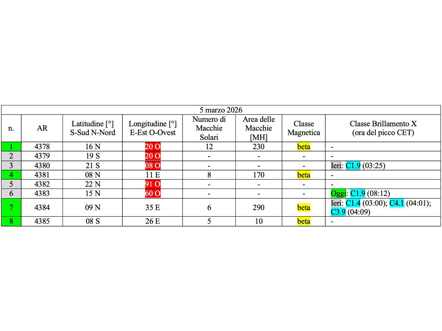 Otto regioni attive sono presenti in fotosfera oggi 05 marzo 2026, di cui 4 con macchie solari e 4 prive di macchie.