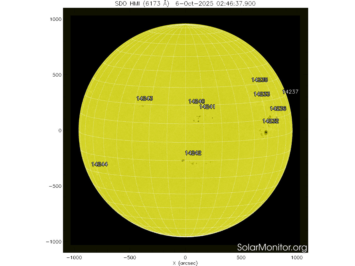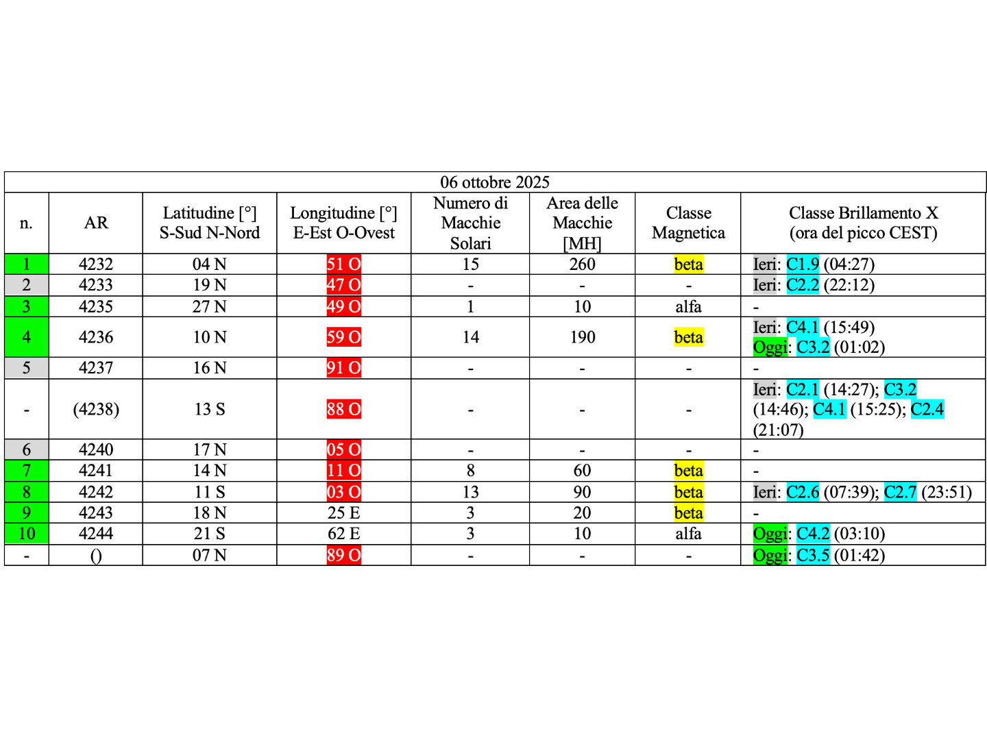 Dieci regioni attive sono presenti in fotosfera oggi 06 ottobre 2025, di cui 7 con macchie solari e 3 prive di macchie.