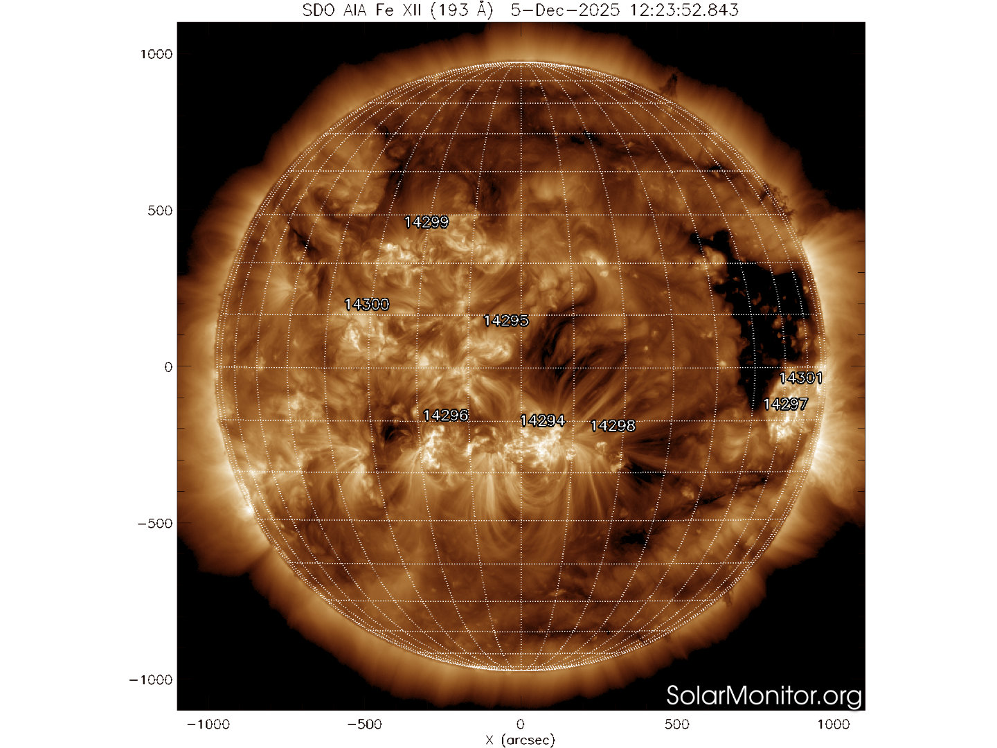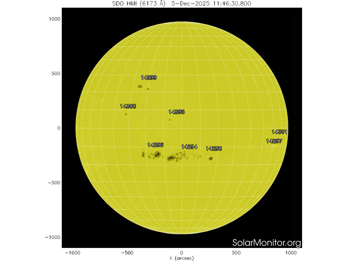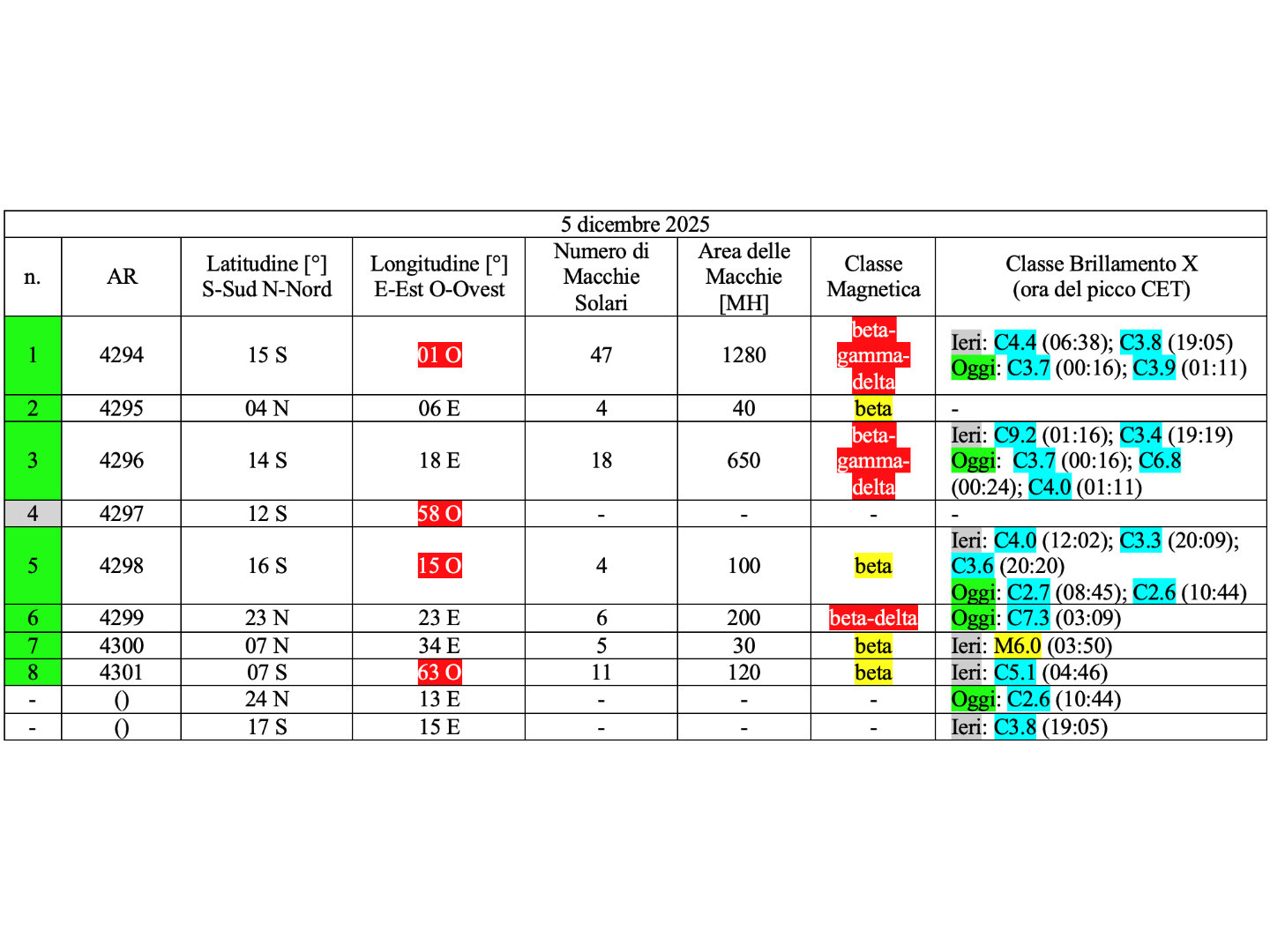 Otto regioni attive sono presenti in fotosfera oggi 05 dicembre 2025, di cui 7 con macchie solari e 1 priva di macchie.