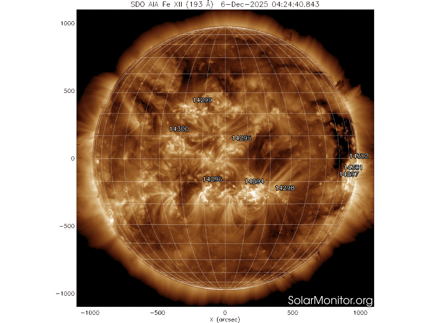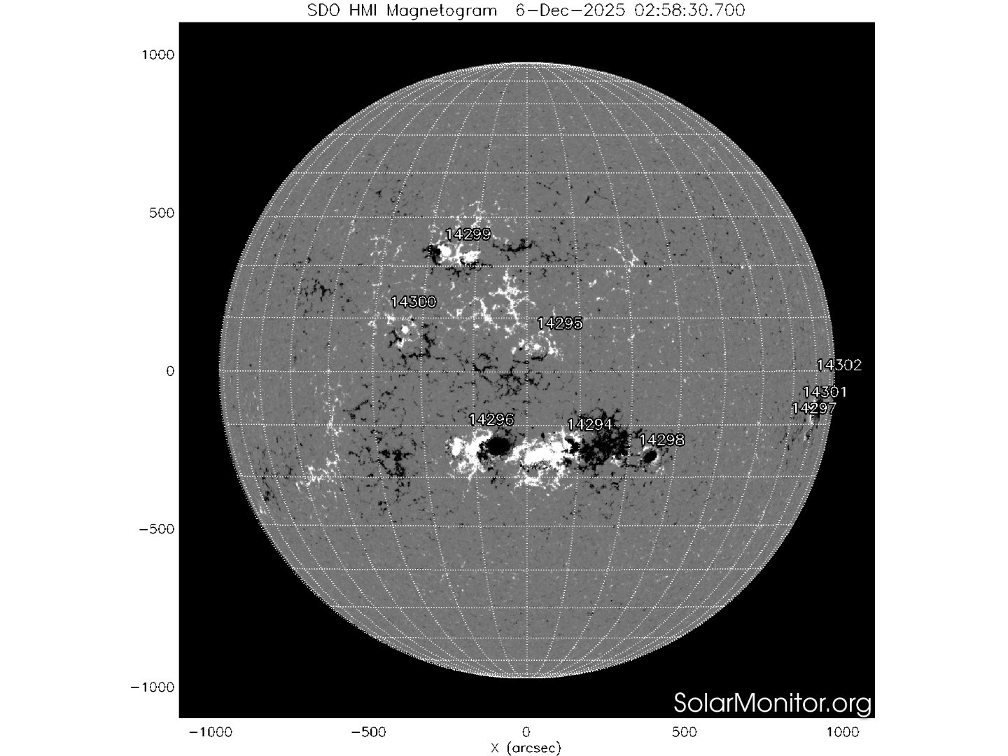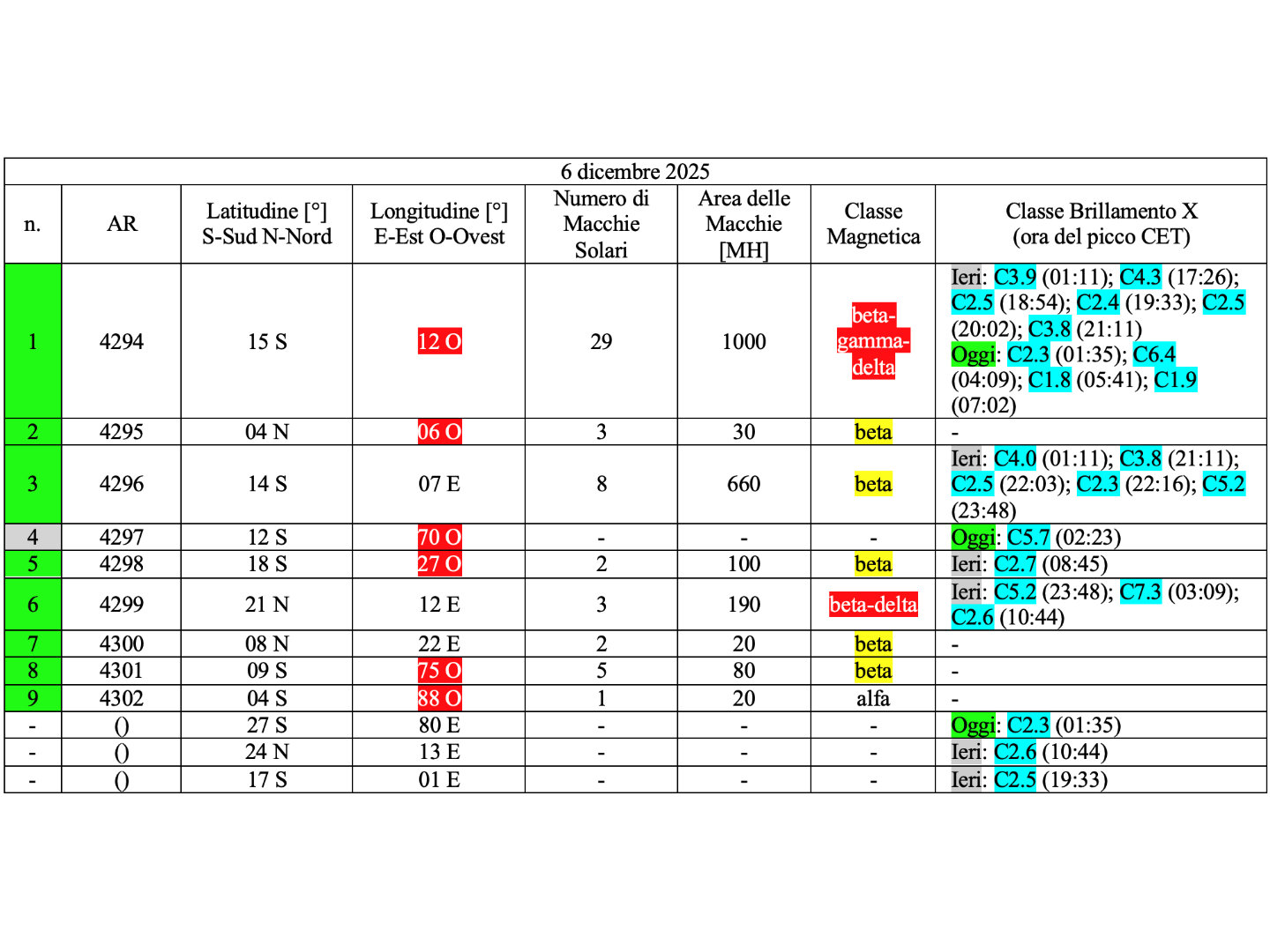 Nove regioni attive sono presenti in fotosfera oggi 06 dicembre 2025, di cui 8 con macchie solari e 1 priva di macchie.