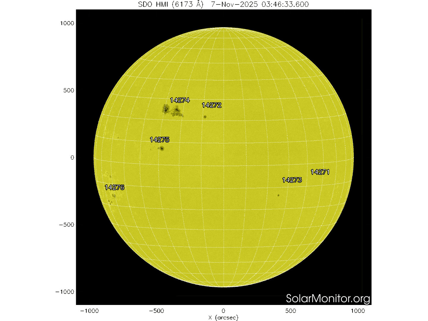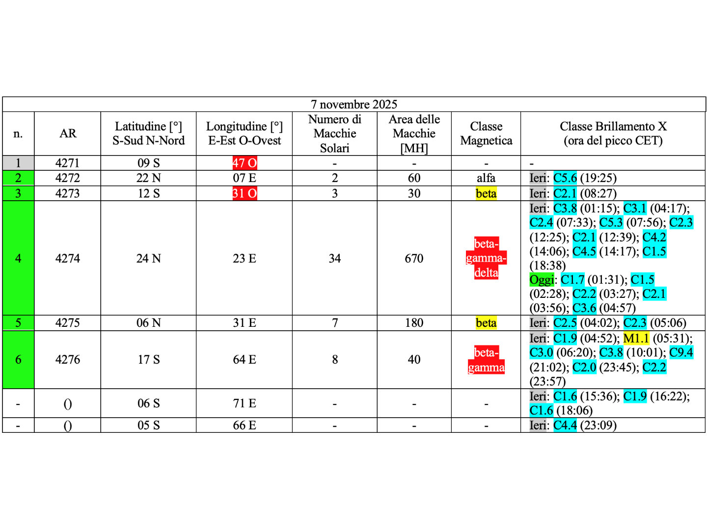 Sei regioni attive sono presenti in fotosfera oggi 07 novembre 2025, di cui 5 con macchie solari e 1 priva di macchie.