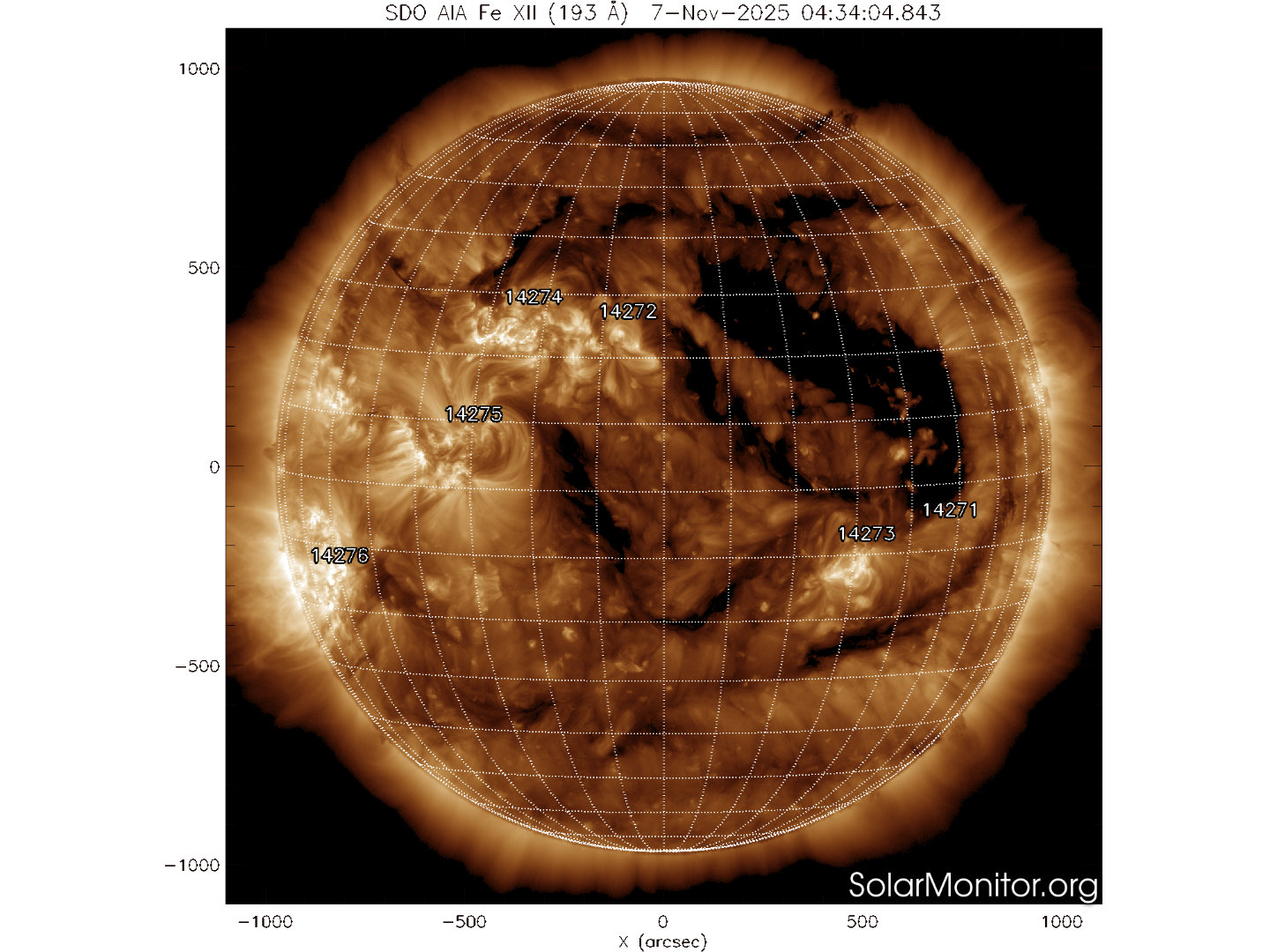 Un buco coronale esteso nell’Emisfero nord si estende a ovest del Meridiano centrale.