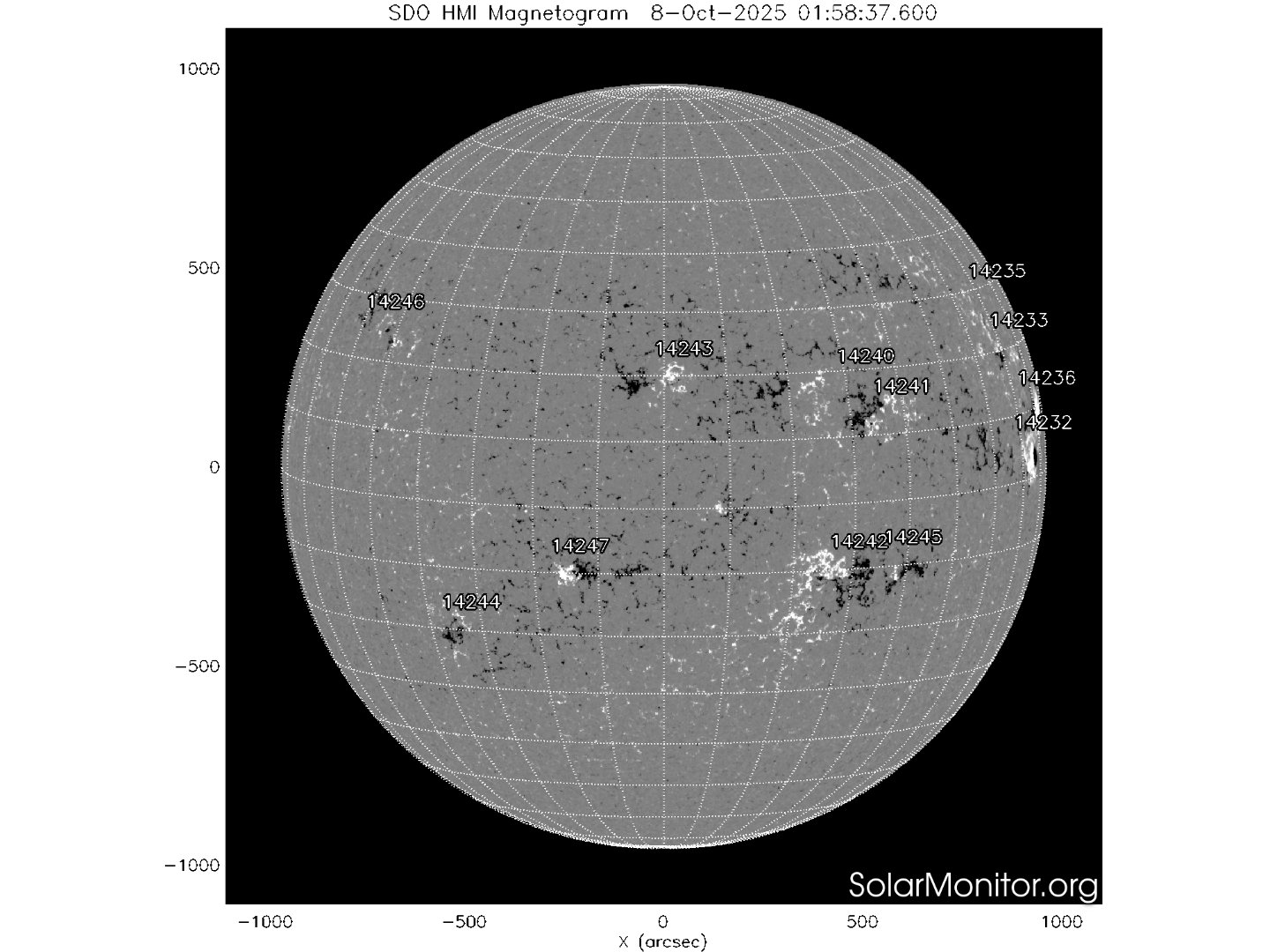 Dodici regioni attive sono presenti in fotosfera oggi 08 ottobre 2025, di cui 7 con macchie solari e 5 prive di macchie.