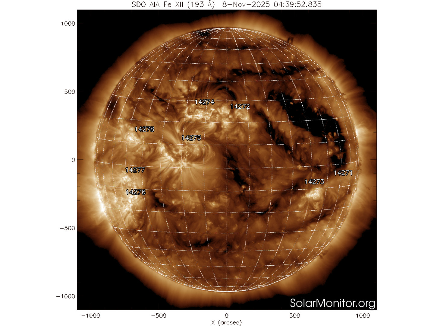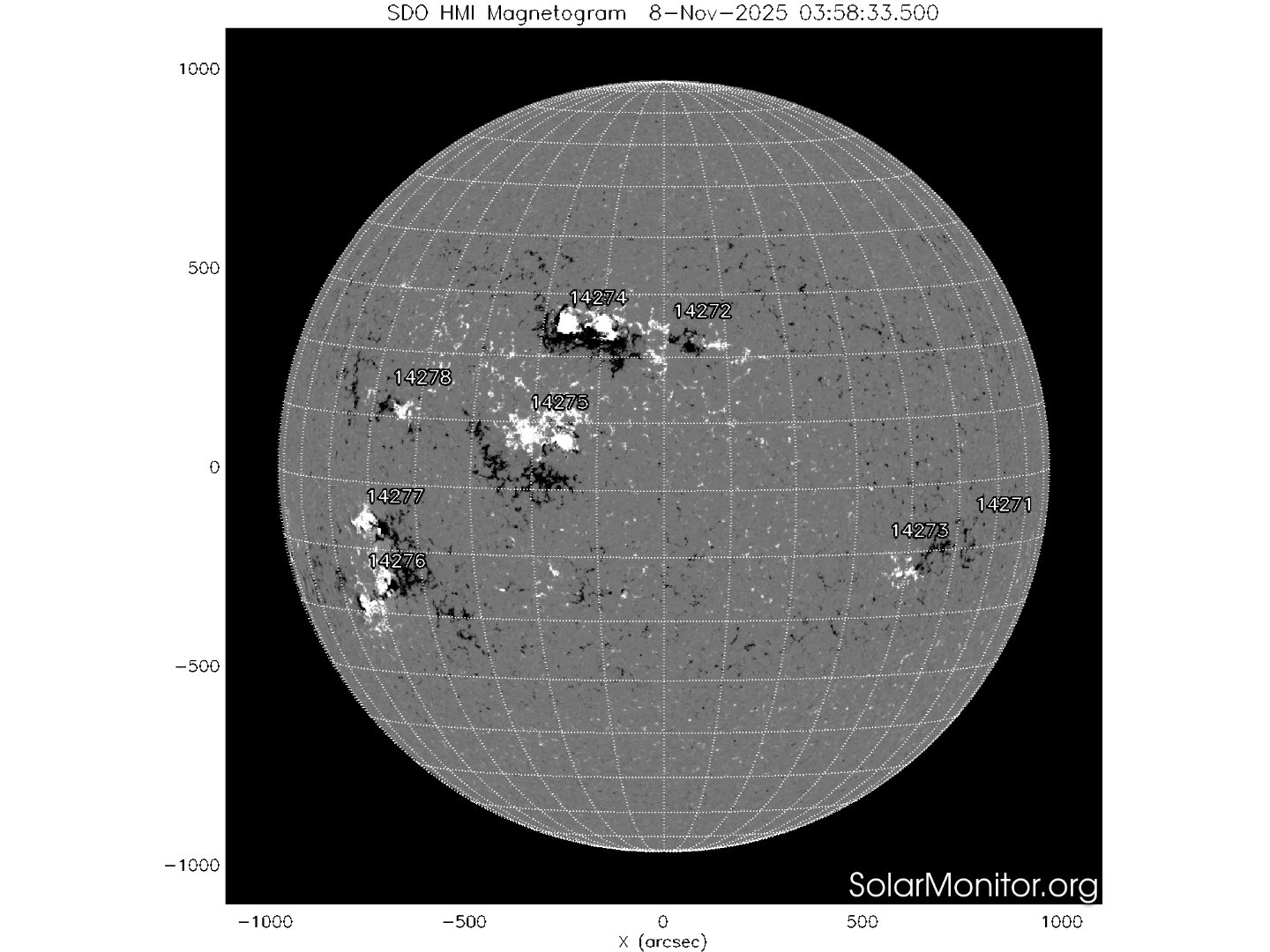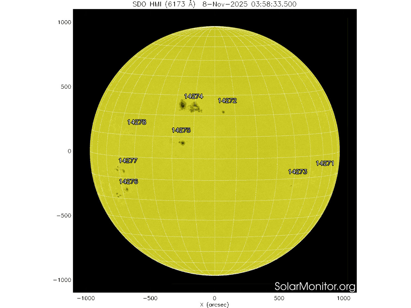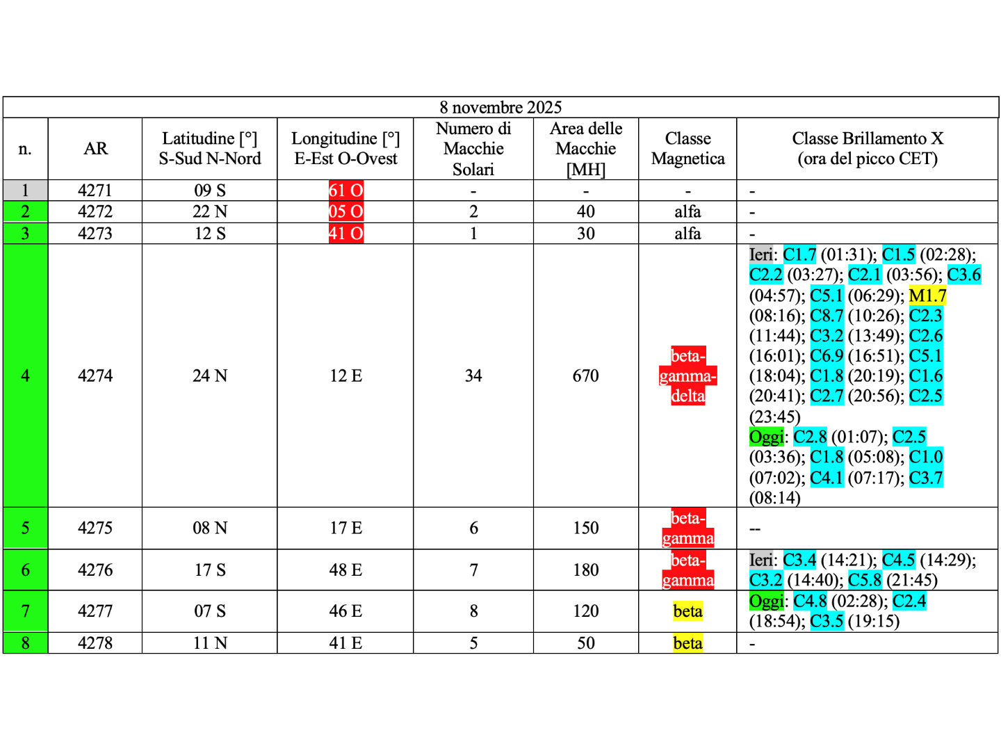 Otto regioni attive sono presenti in fotosfera oggi 08 novembre 2025, di cui 7 con macchie solari e 1 priva di macchie.