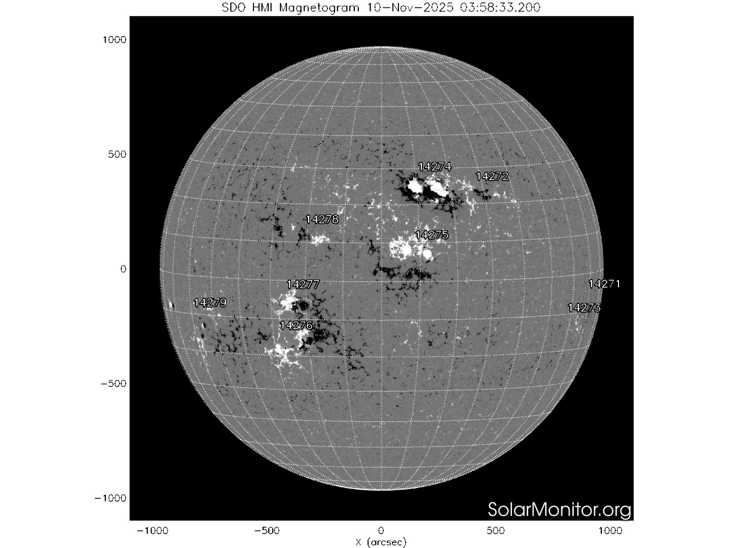 Nove regioni attive sono presenti in fotosfera oggi 10 novembre 2025, di cui 7 con macchie solari e 2 prive di macchie.
