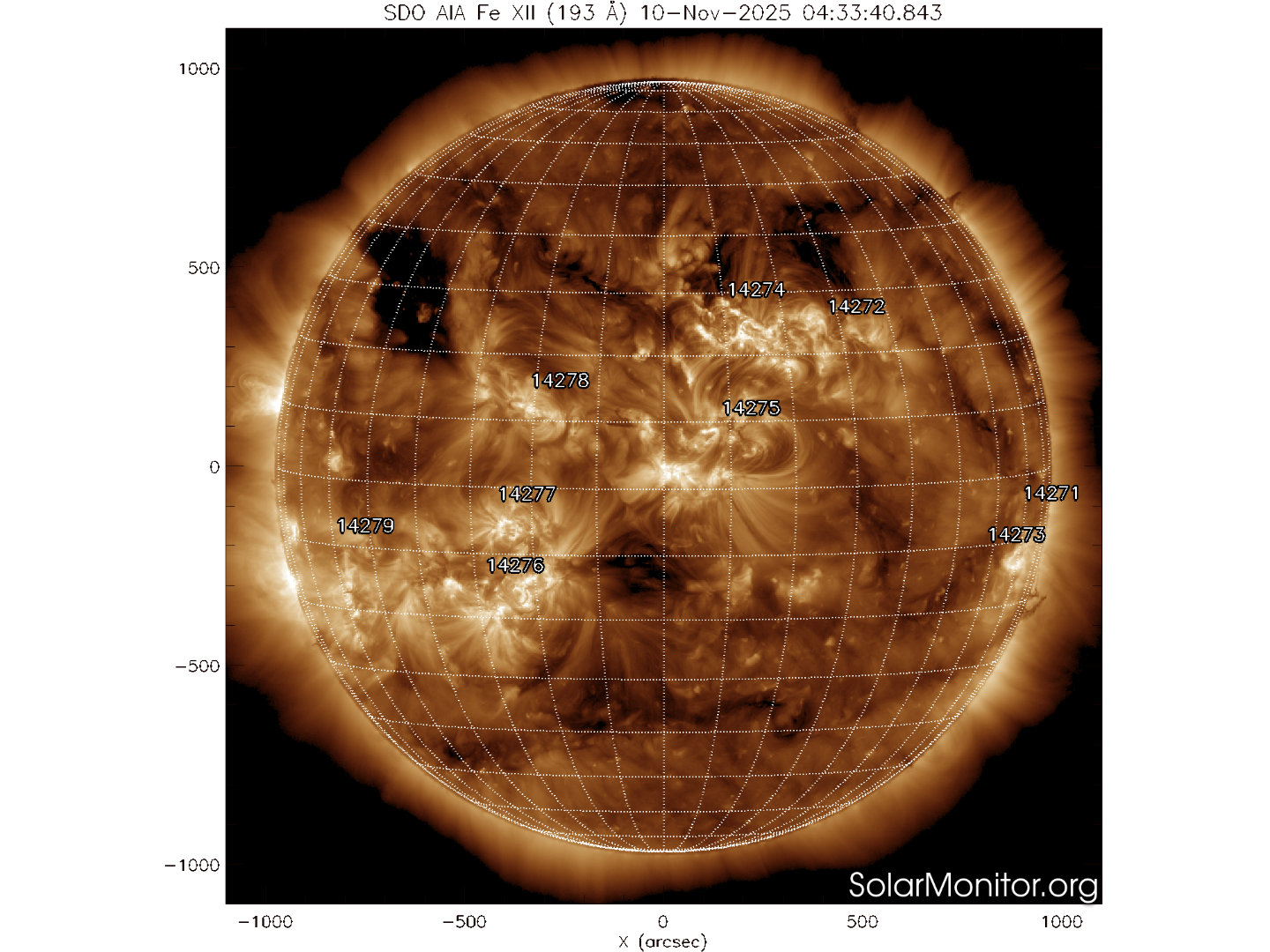 Due buchi coronali nell’Emisfero nord si trovano a est e a ovest del Meridiano centrale. Un Buco coronale nell’Emisfero sud di trova sul Meridiano centrale.