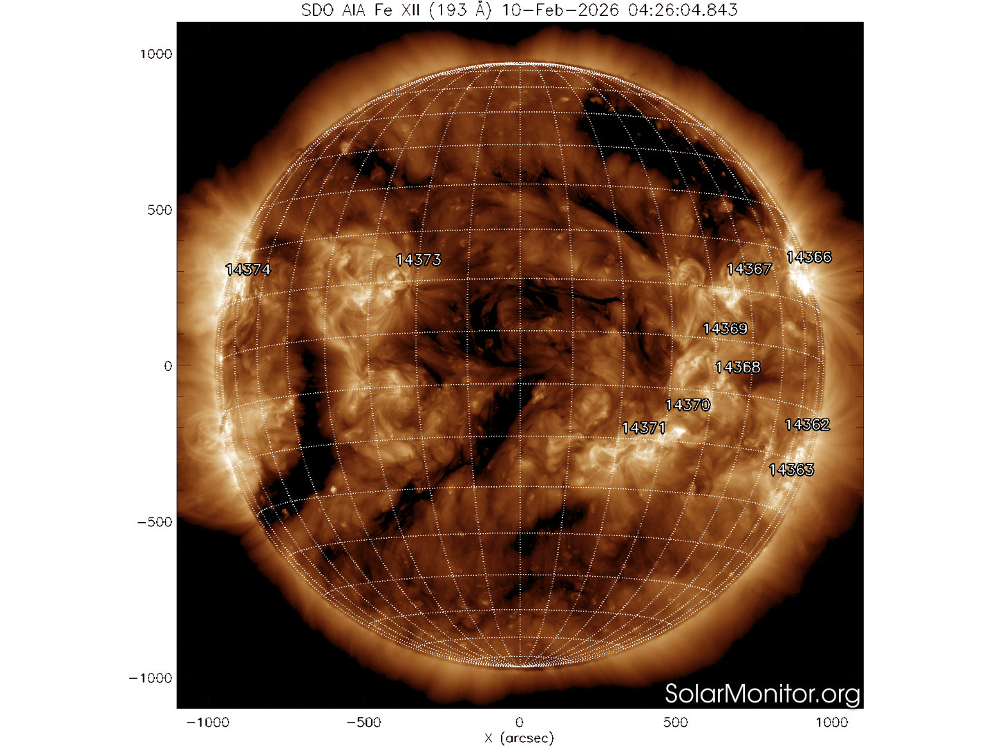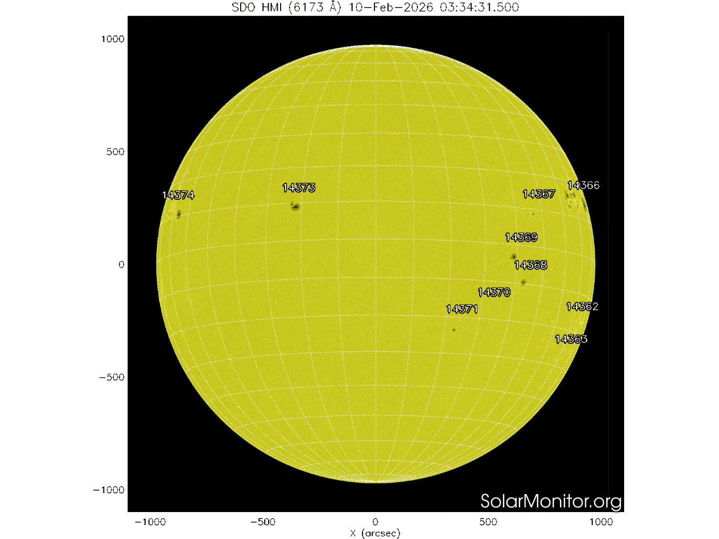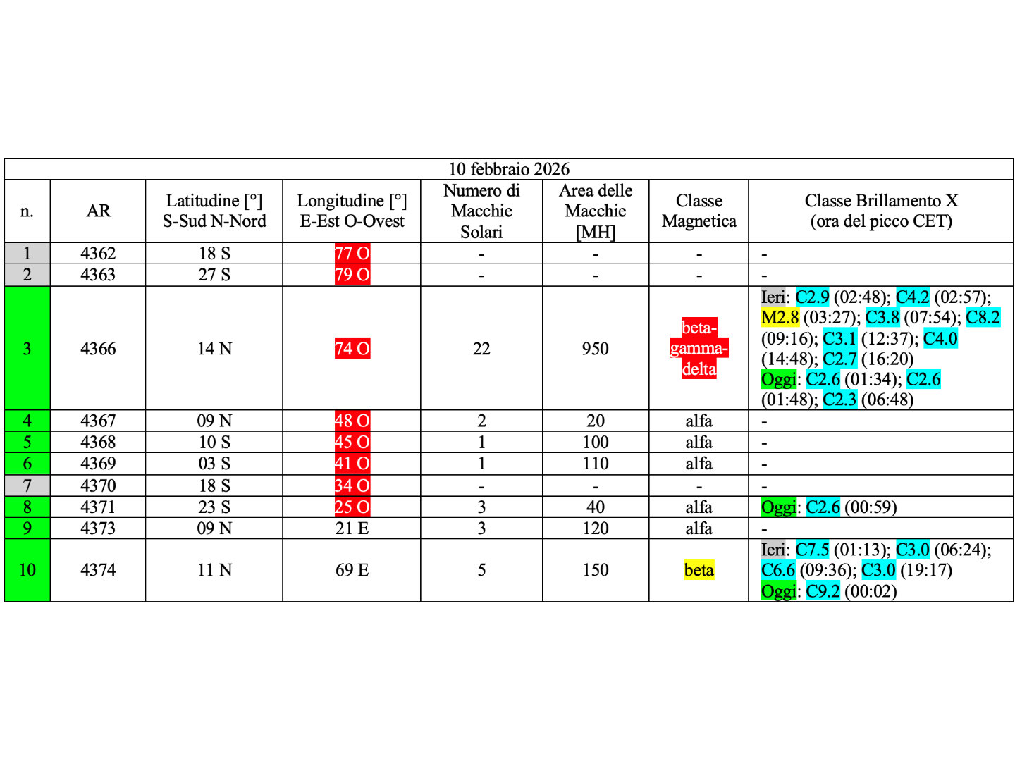 Dieci regioni attive sono presenti in fotosfera oggi 10 febbraio 2026, di cui 7 con macchie solari e 3 prive di macchie.