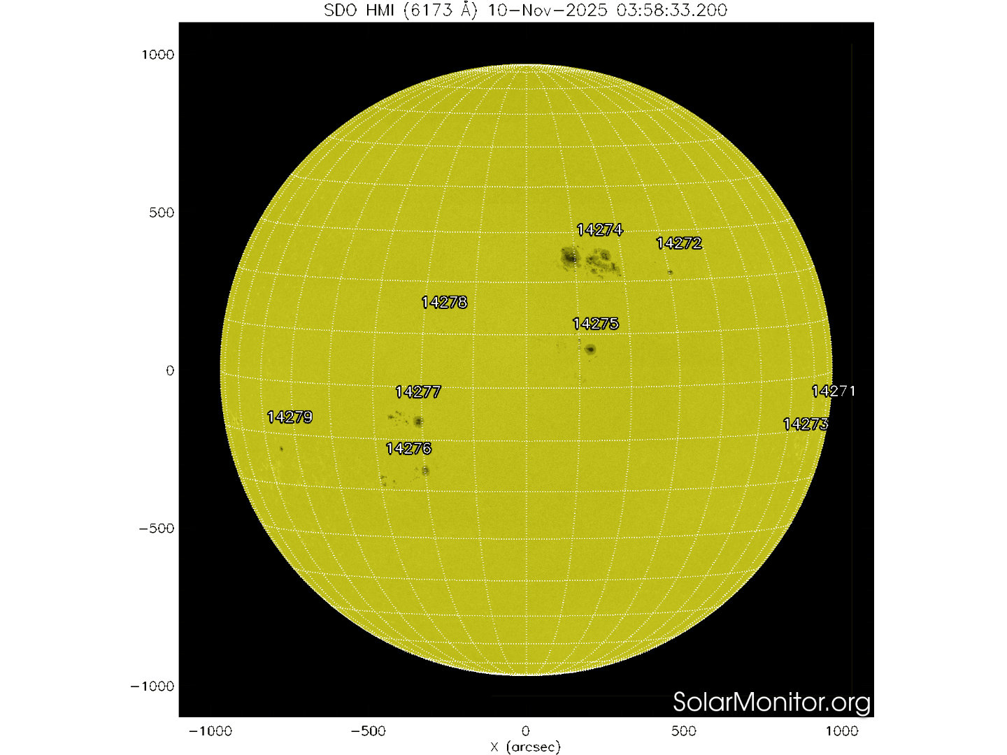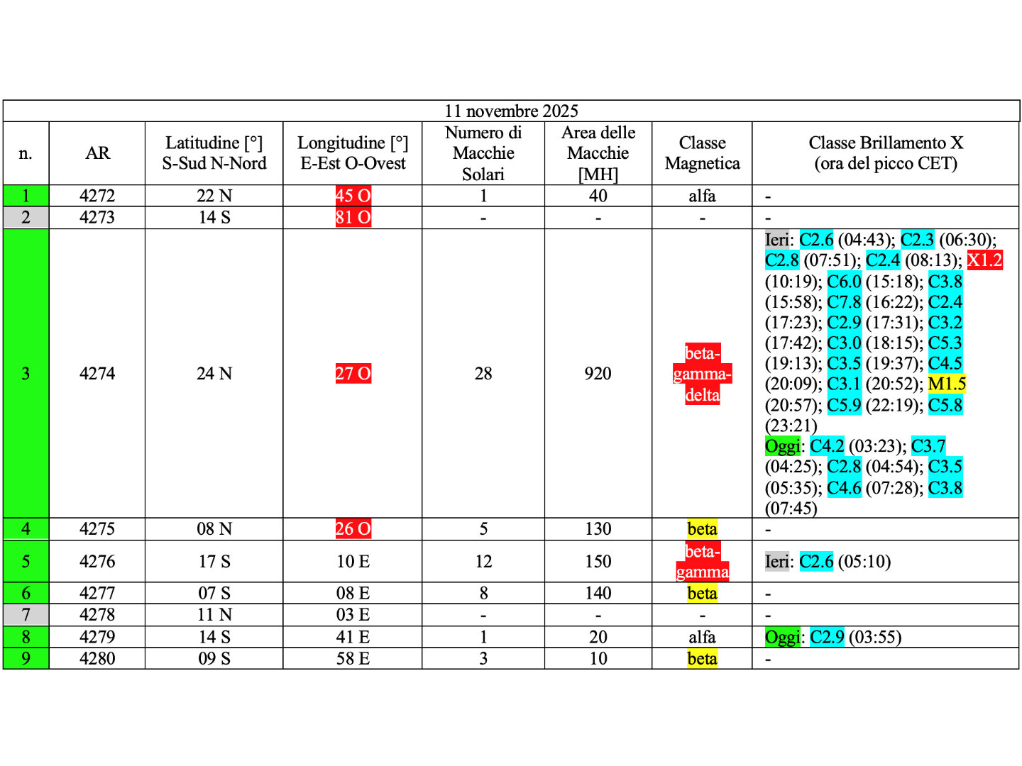 Nove regioni attive sono presenti in fotosfera oggi 11 novembre 2025, di cui 7 con macchie solari e 2 prive di macchie.