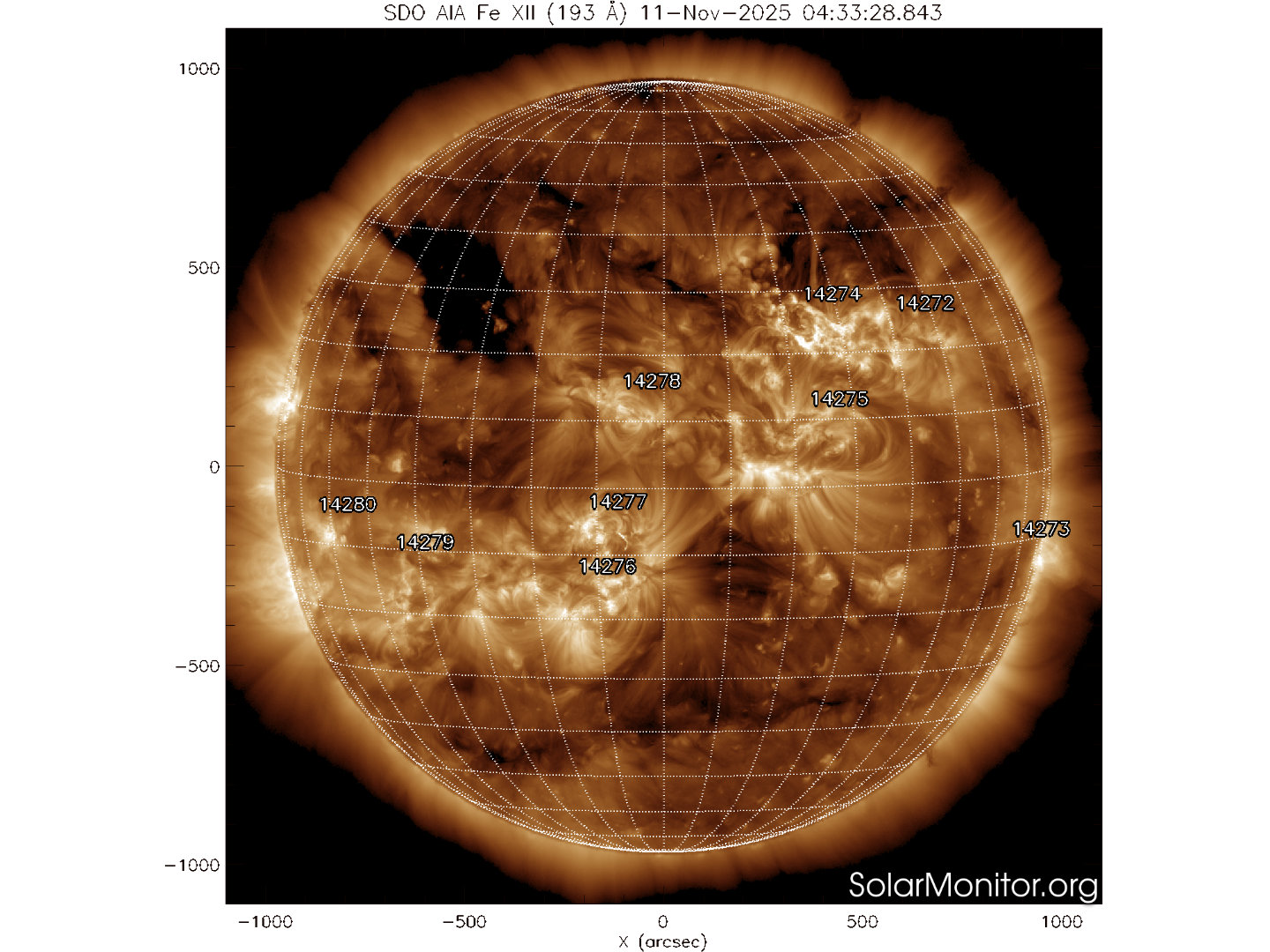 Due buchi coronali nell’Emisfero nord si trovano a est e a ovest del Meridiano centrale. Un Buco coronale nell’Emisfero sud di trova sul Meridiano centrale.