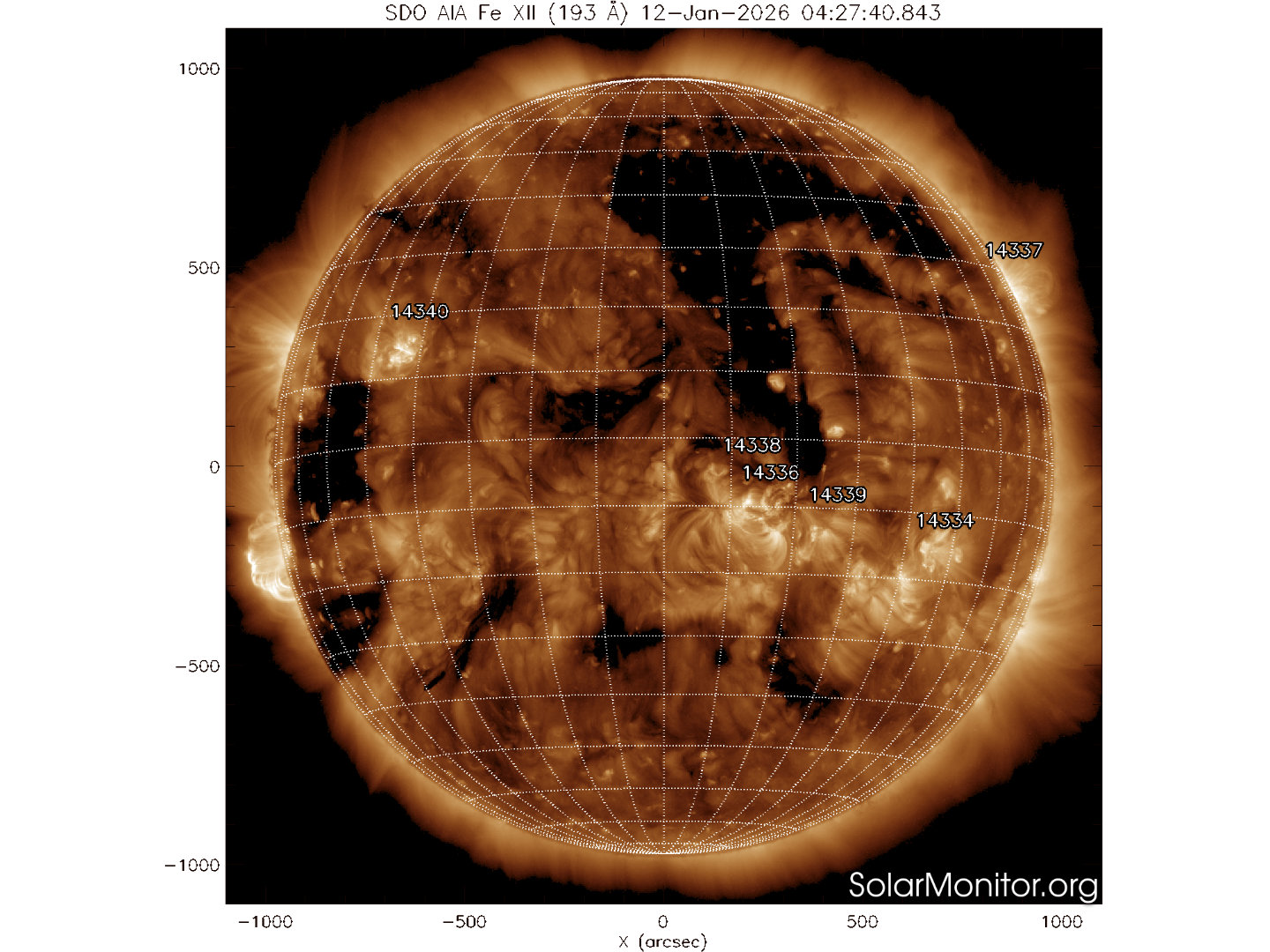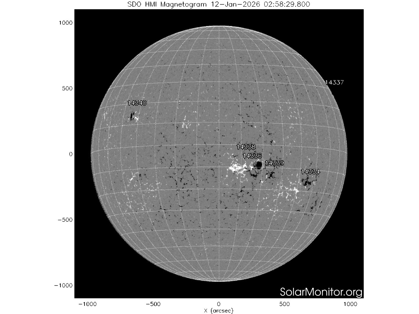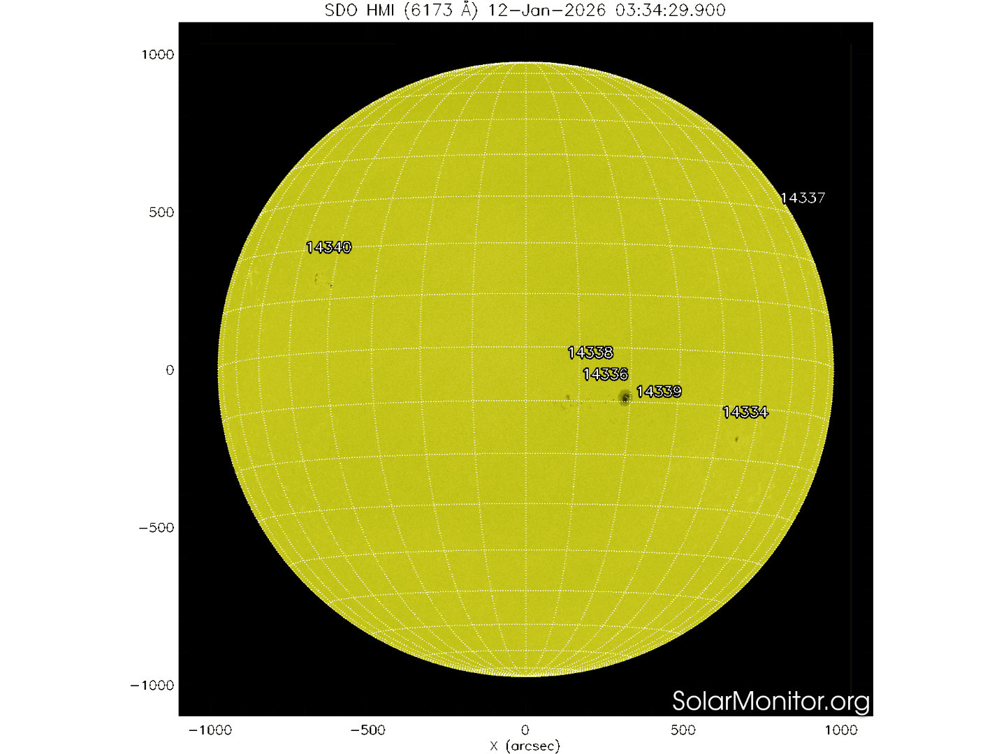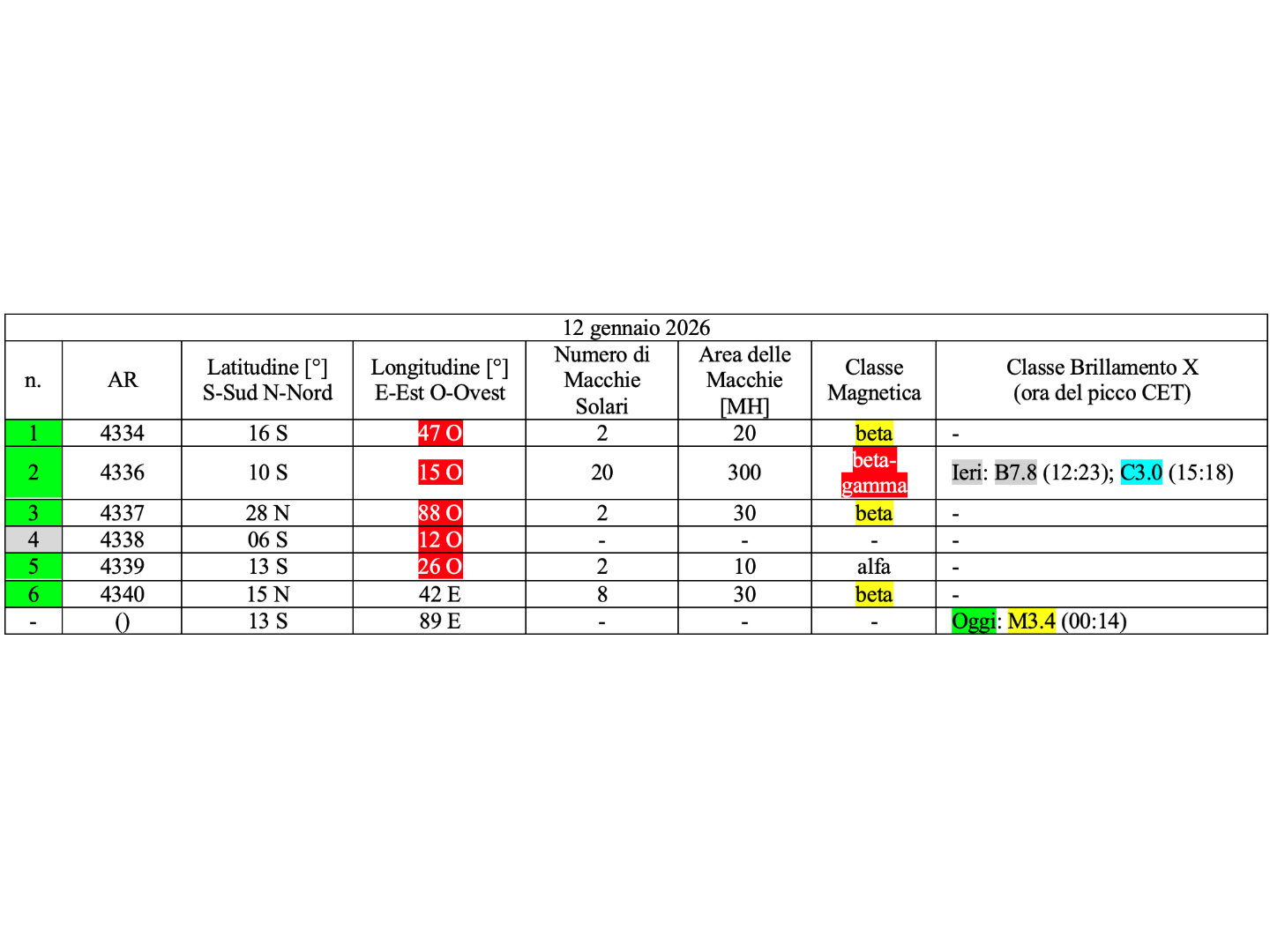 Sei regioni attive sono presenti in fotosfera oggi 12 gennaio 2026, di cui 5 con macchie solari e 1 priva di macchie.
