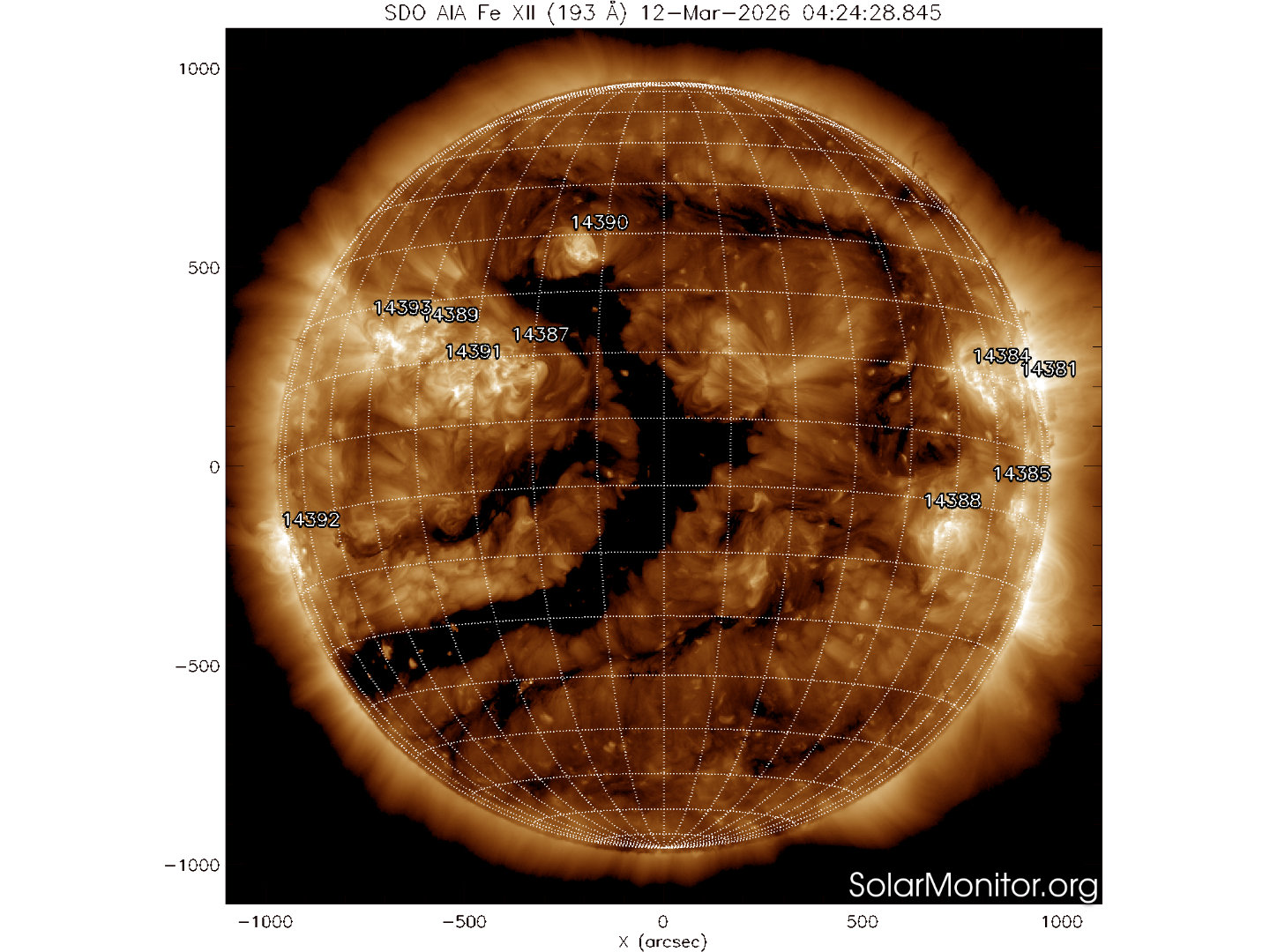Dieci regioni attive sono presenti in fotosfera oggi 12 marzo 2026, di cui 9 con macchie solari e 1 priva di macchie.