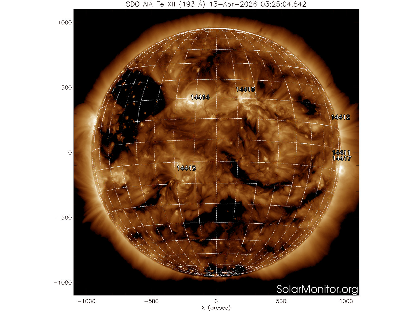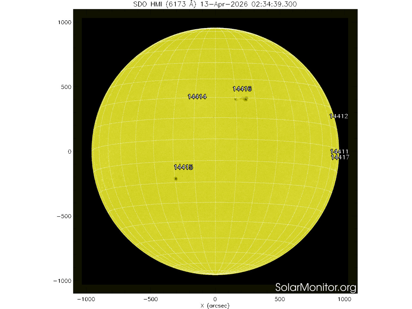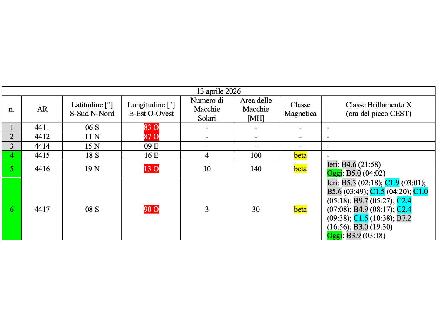 Sei regioni attive sono presenti in fotosfera oggi 13 aprile 2026, di cui 3 con macchie solari e 3 prive di macchie.