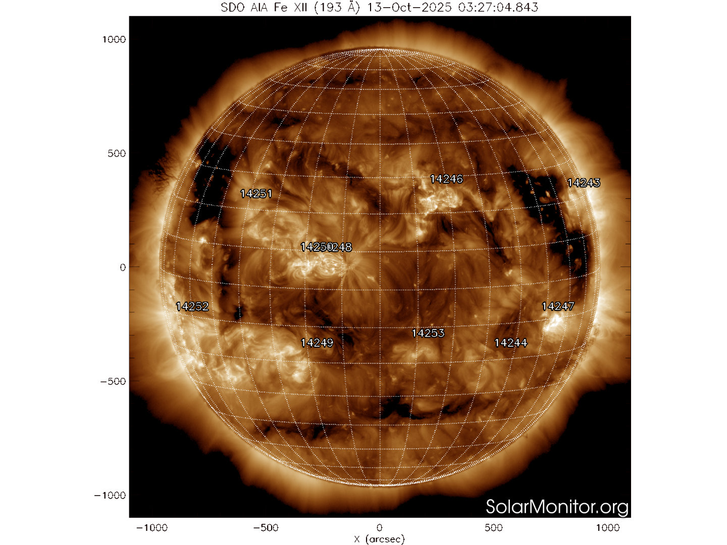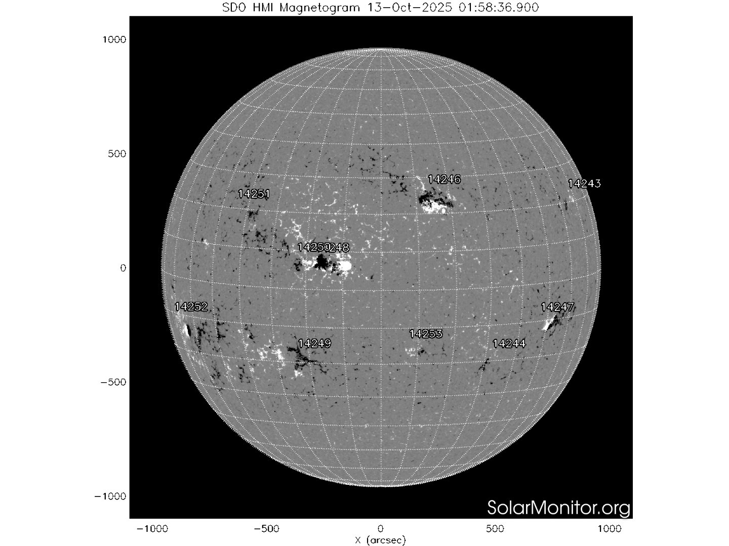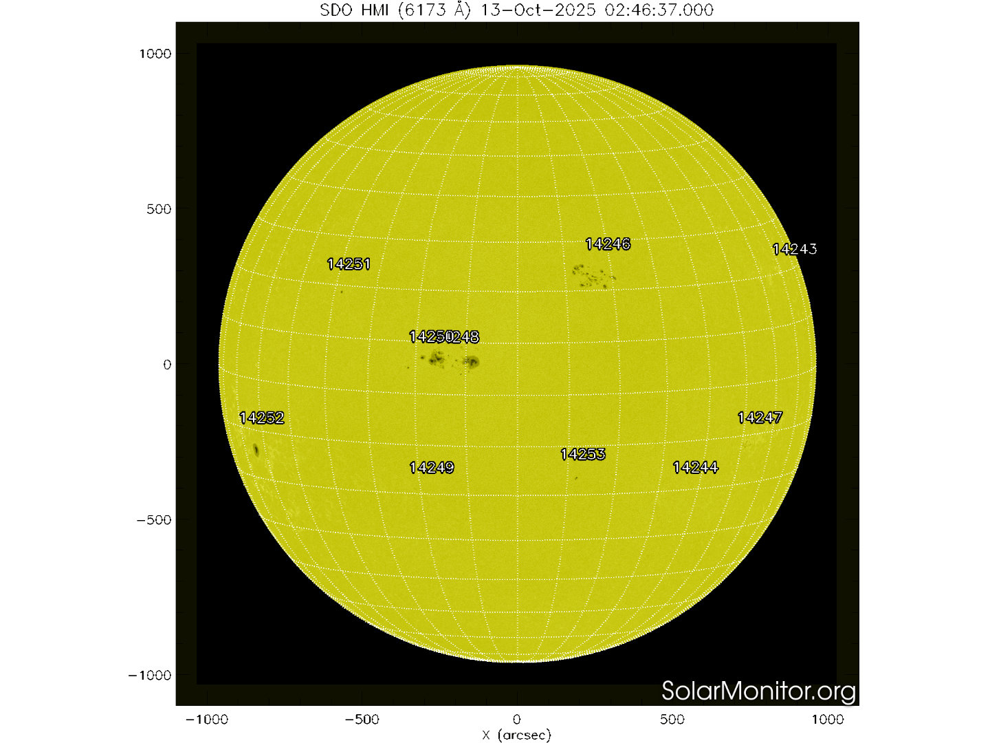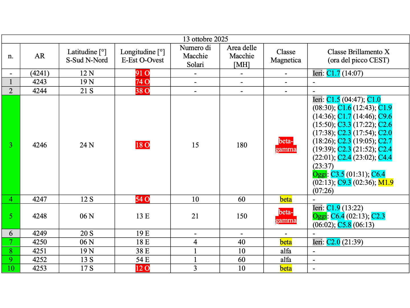 Dieci regioni attive sono presenti in fotosfera oggi 13 ottobre 2025, di cui 7 con macchie solari e 3 prive di macchie.
