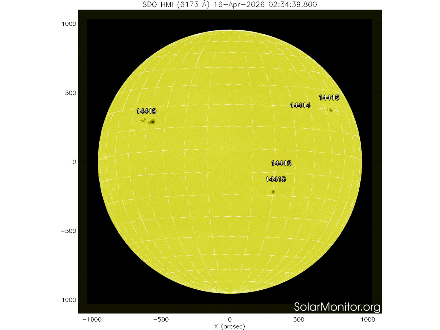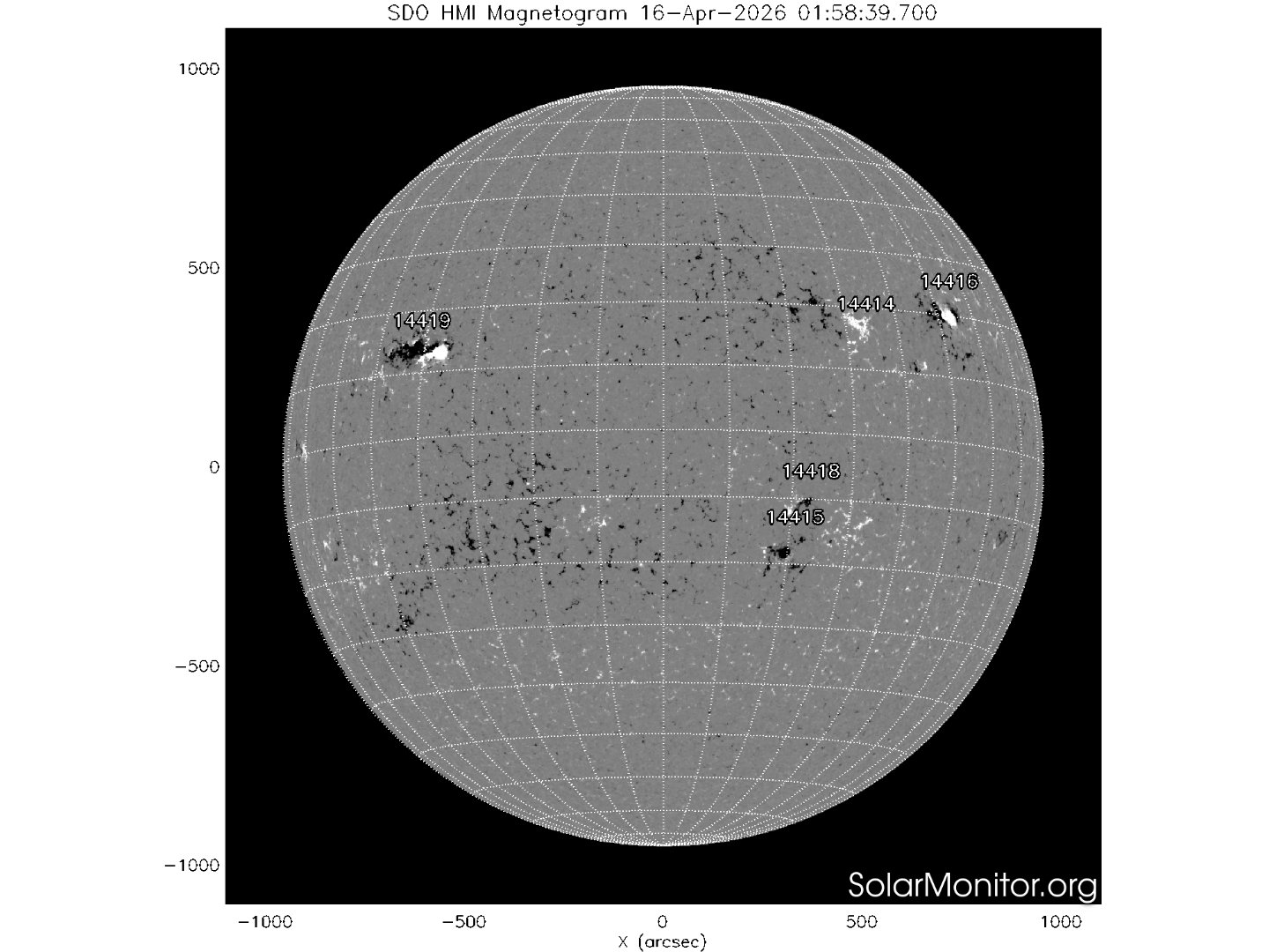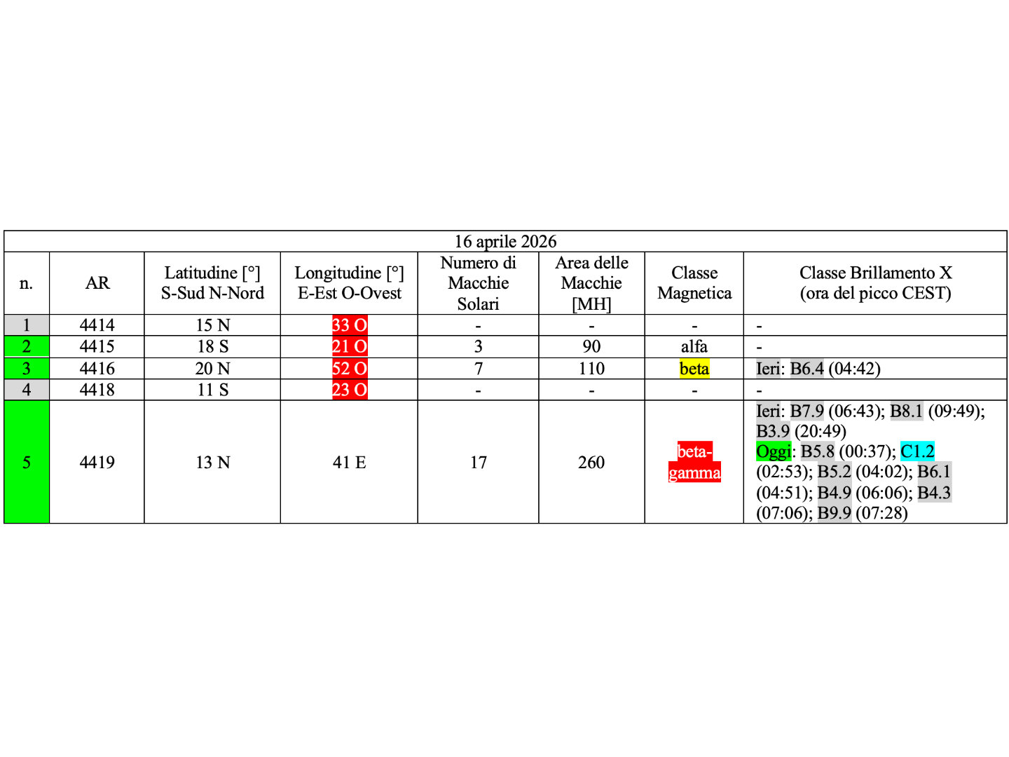Cinque regioni attive sono presenti in fotosfera oggi 16 aprile 2026, di cui 3 con macchie solari e 2 prive di macchie.