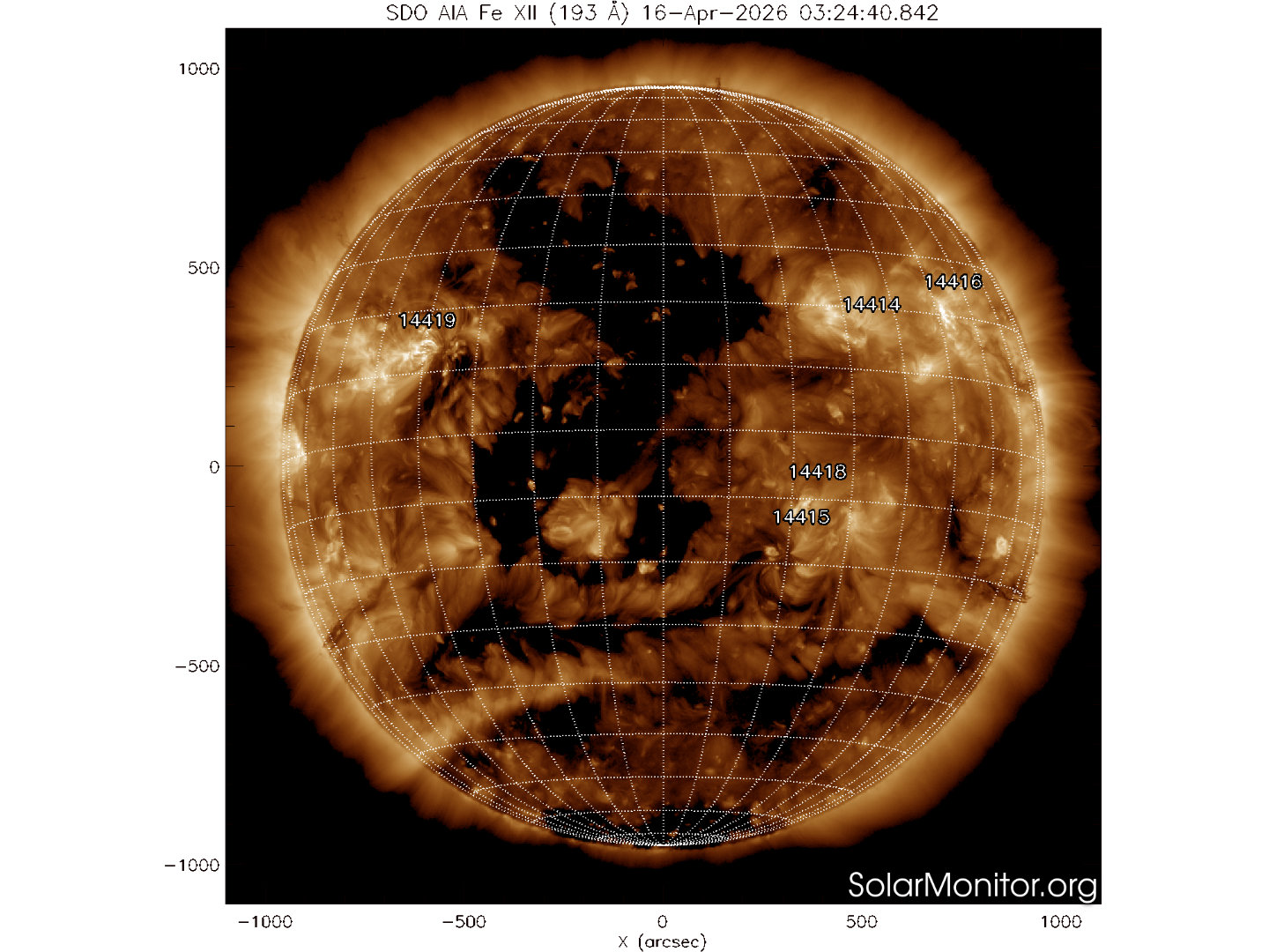 Un buco coronale esteso si trova nell’Emisfero nord e all’Equatore sul Meridiano centrale.