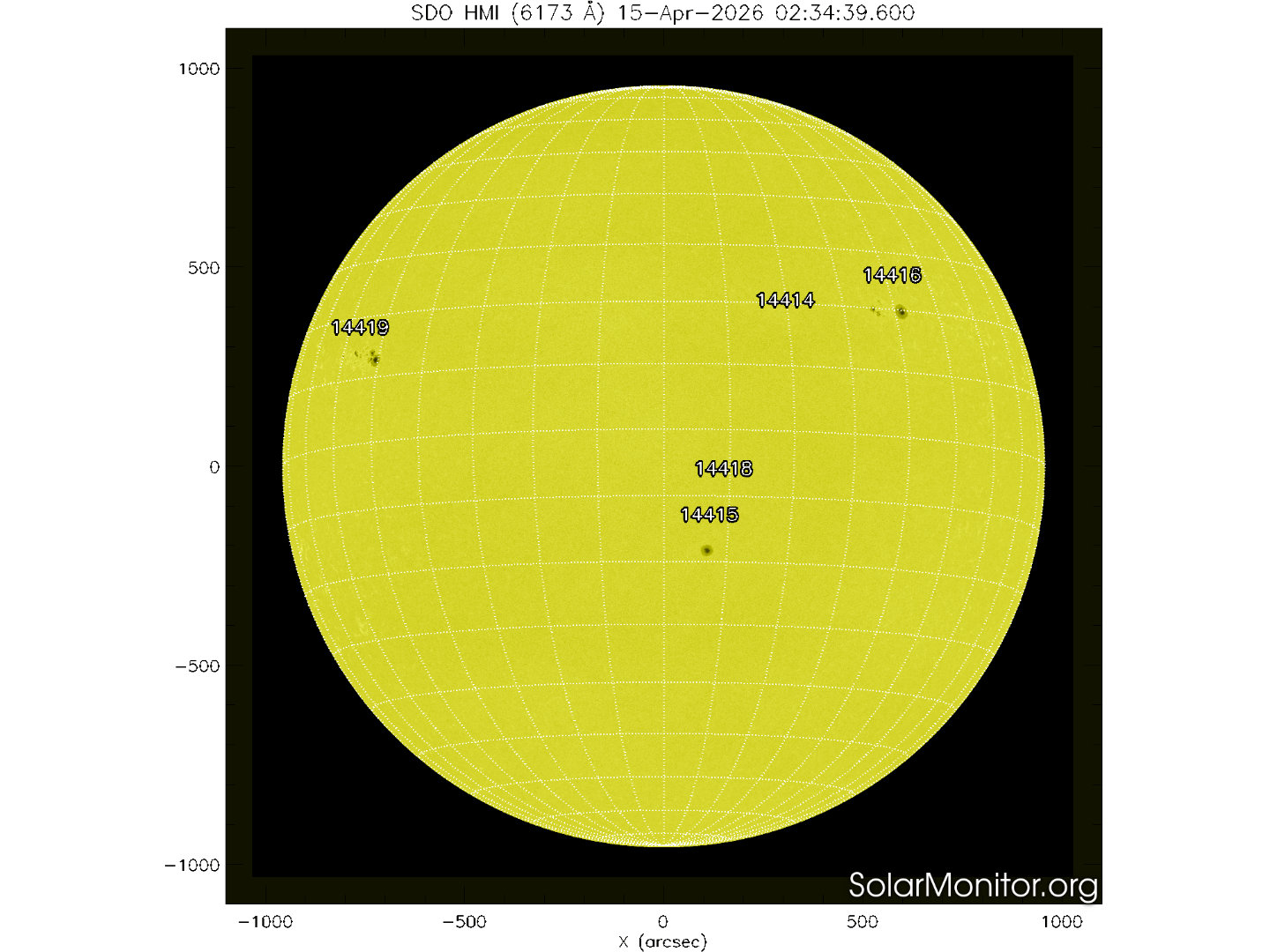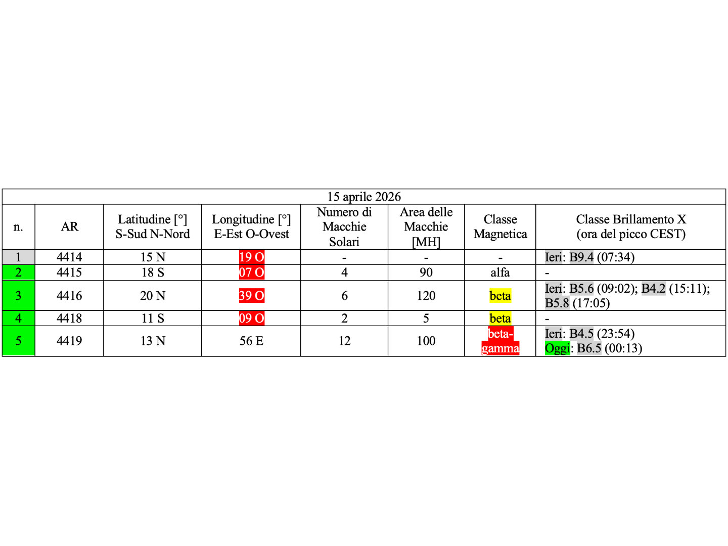 Cinque regioni attive sono presenti in fotosfera oggi 15 aprile 2026, di cui 4 con macchie solari e 1 priva di macchie.