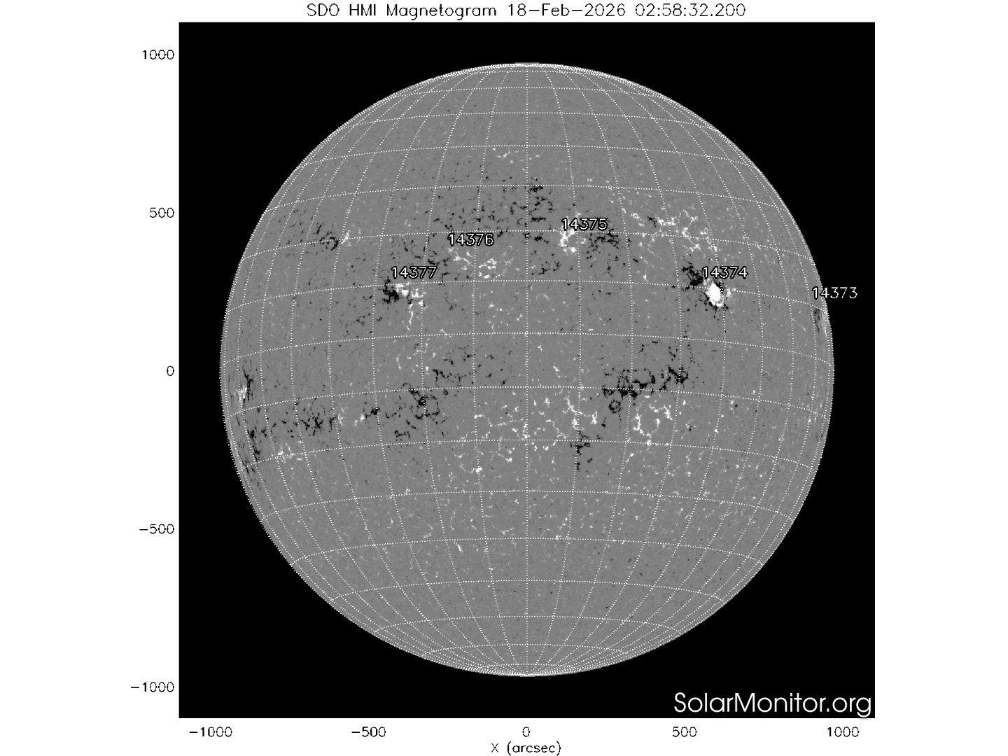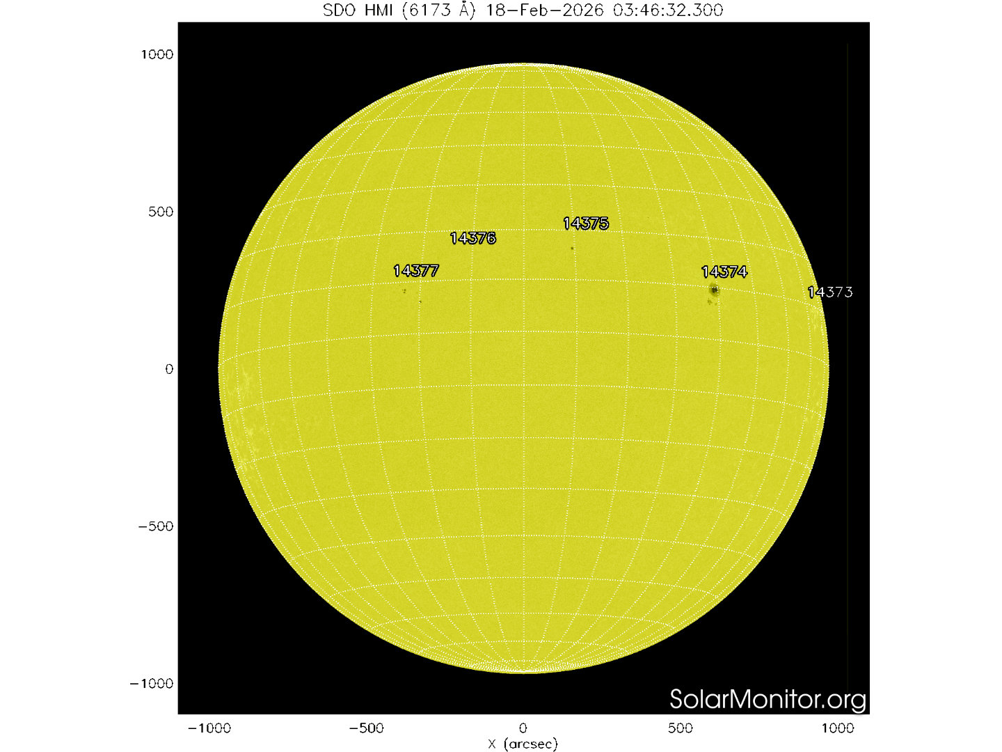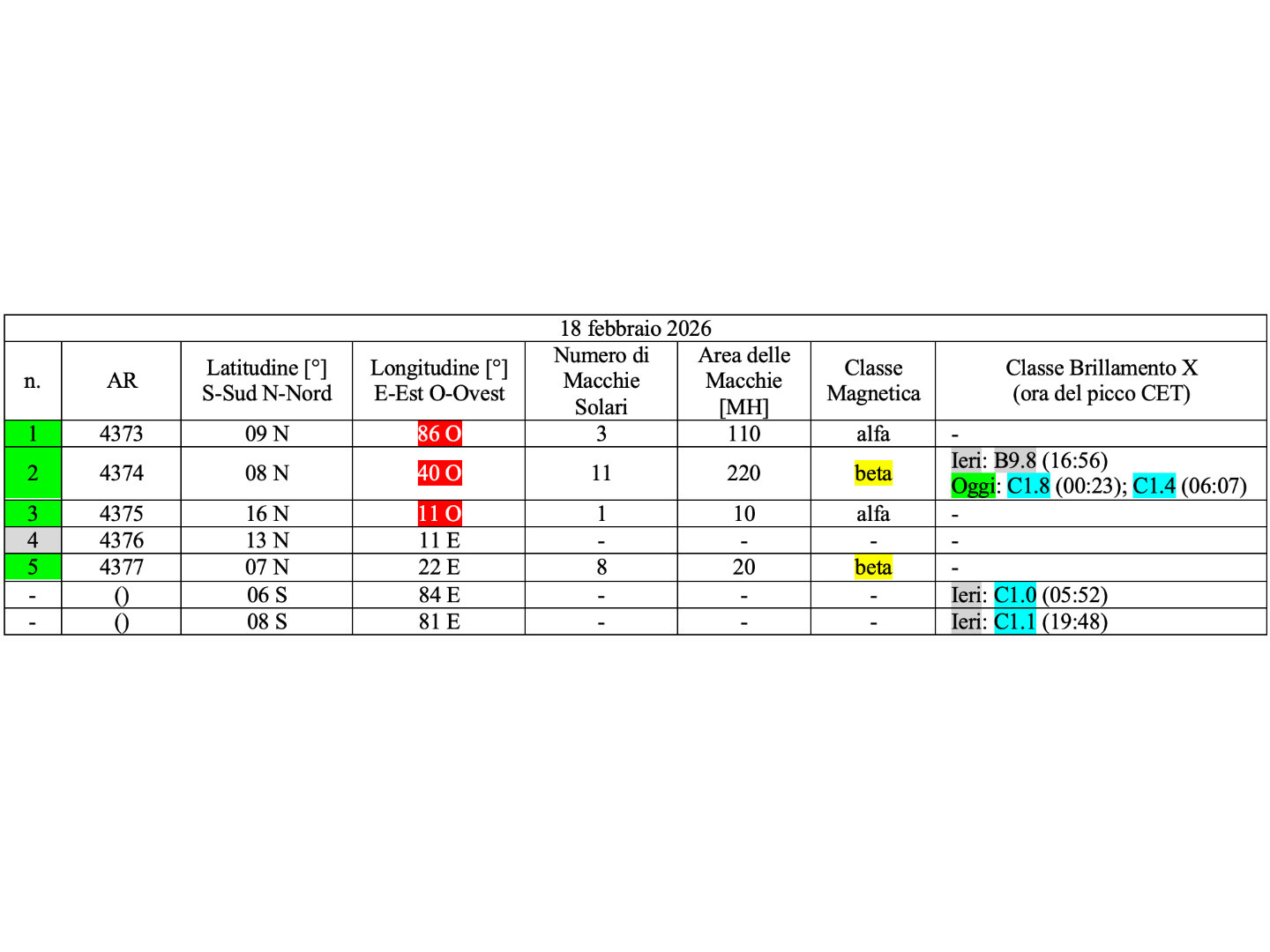 Cinque regioni attive sono presenti in fotosfera oggi 18 febbraio 2026, di cui 4 con Macchie solari ed 1 priva di macchie solari.