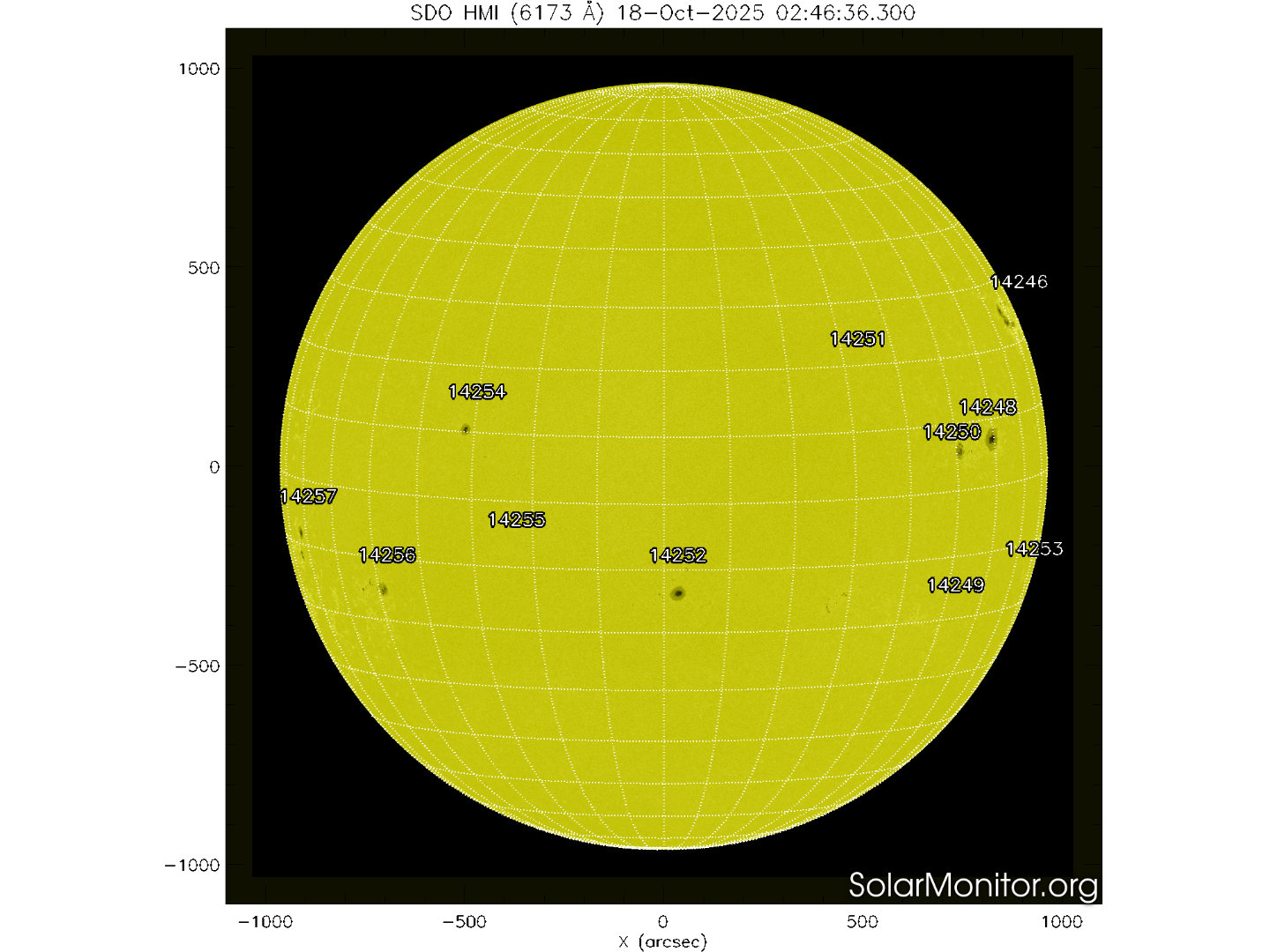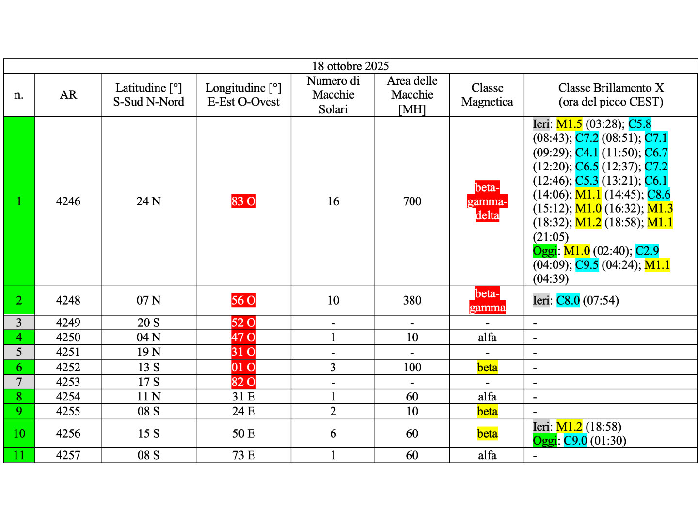 Undici regioni attive sono presenti in fotosfera oggi 18 ottobre 2025, di cui 8 con macchie solari e 3 prive di macchie.