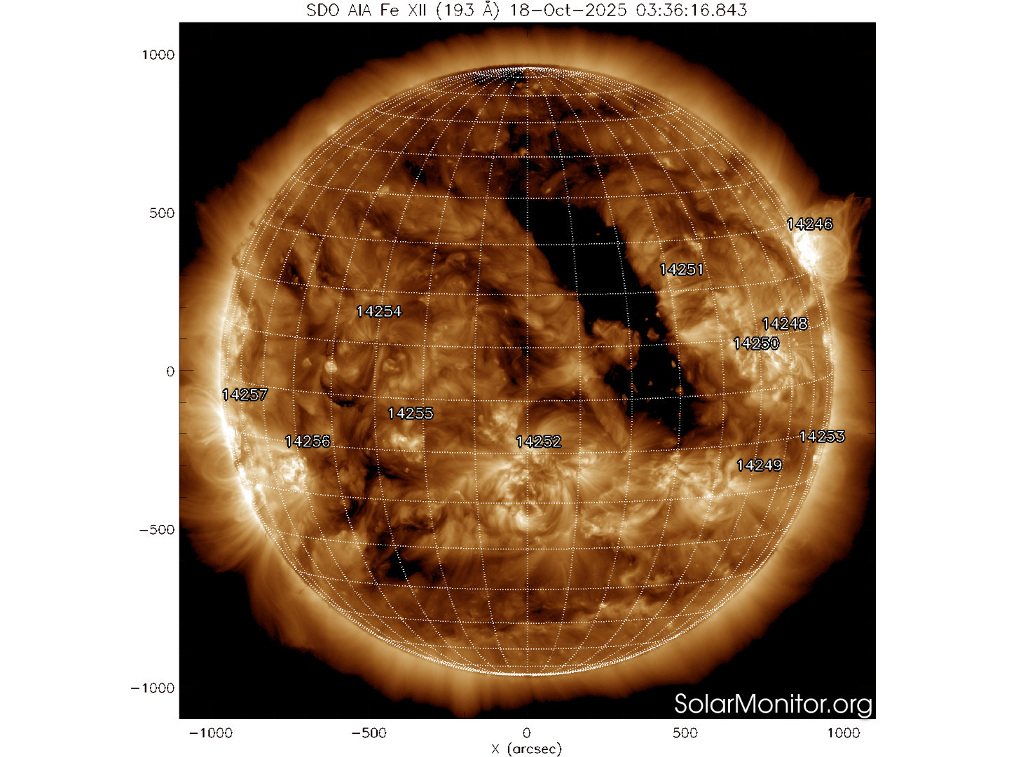Un buco coronale esteso nell’Emisfero nord e in quello sud si trova sul Meridiano centrale e a ovest di esso.