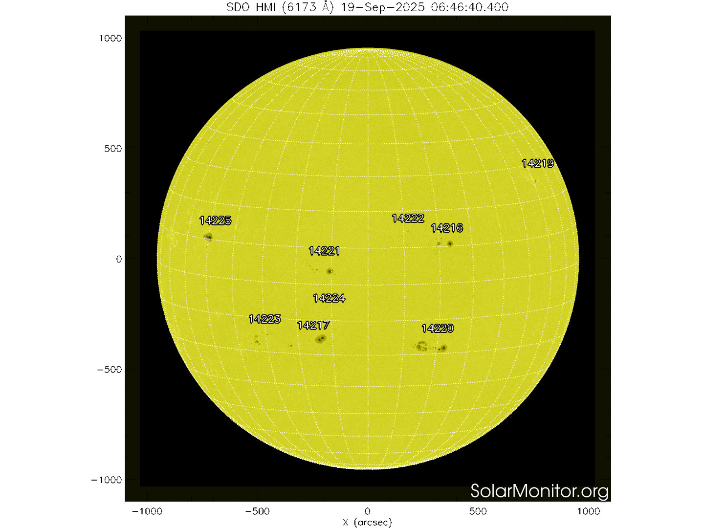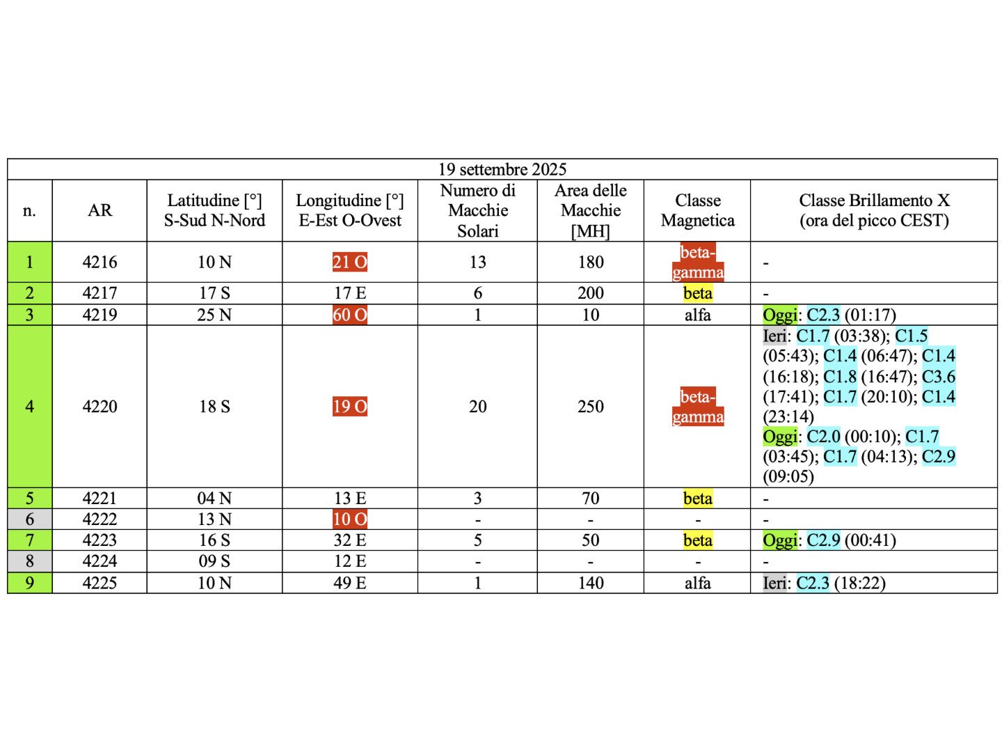 Nove regioni attive sono presenti in fotosfera oggi 20 settembre 2025, di cui 7 con macchie solari e 2 prive di macchie.