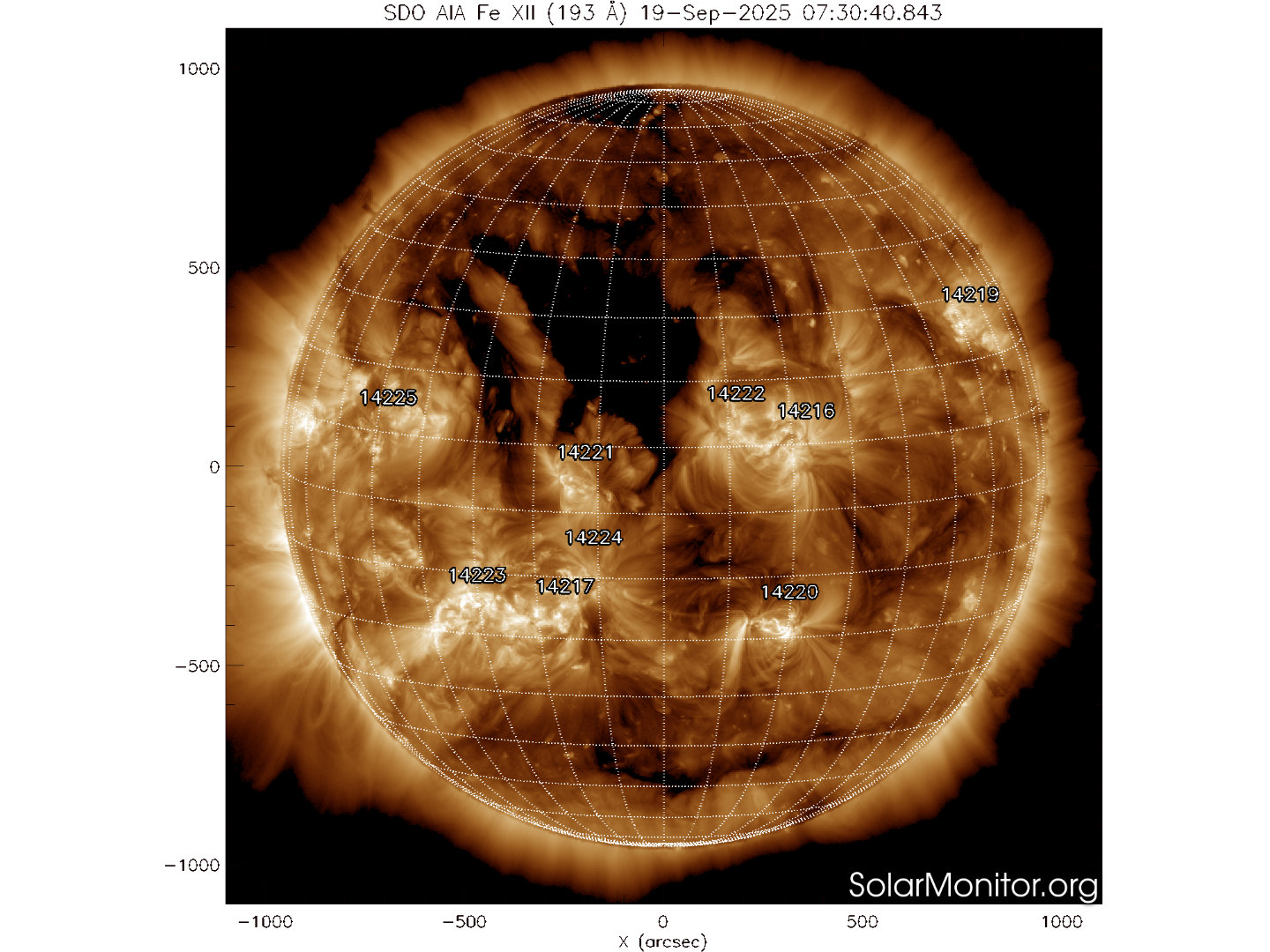 Un buco coronale molto esteso è visibile nell’Emisfero nord a est e sul Meridiano centrale.