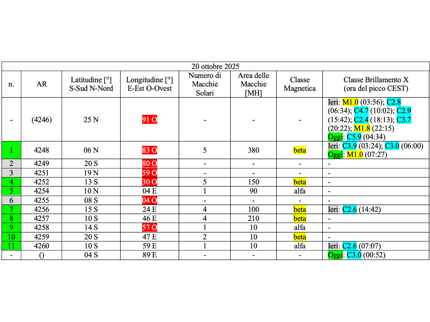 Undici regioni attive sono presenti in fotosfera oggi 20 ottobre 2025, di cui 8 con macchie solari e 3 prive di macchie.