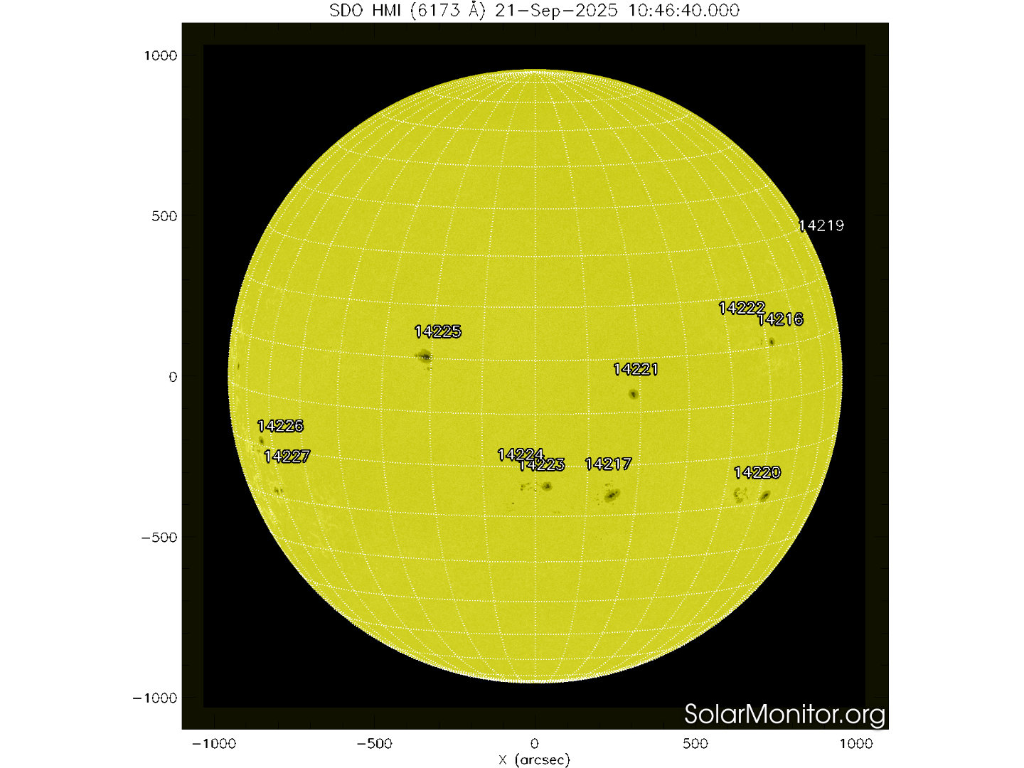 Nove regioni attive sono presenti in fotosfera oggi 21 settembre 2025, 11 con macchie solari e 1 priva di macchie.