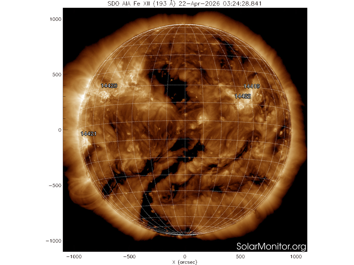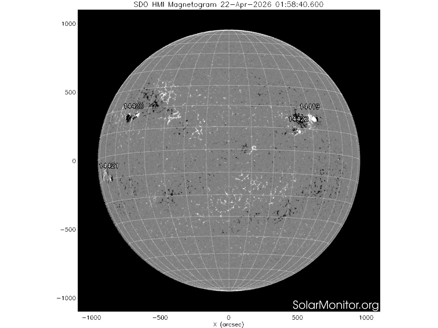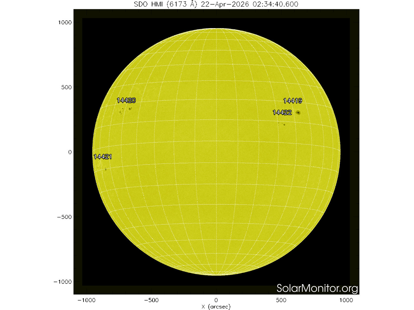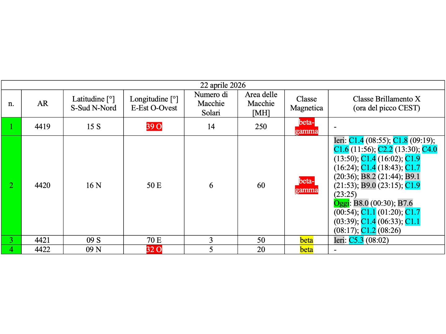 Quattro regioni attive sono presenti in fotosfera oggi 22 aprile 2026, tutte con macchie solari.