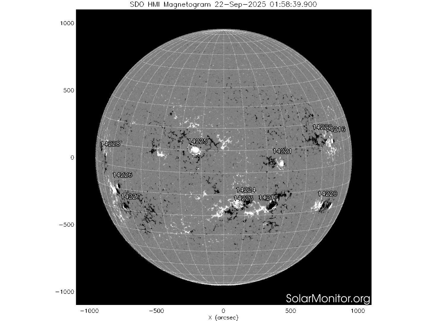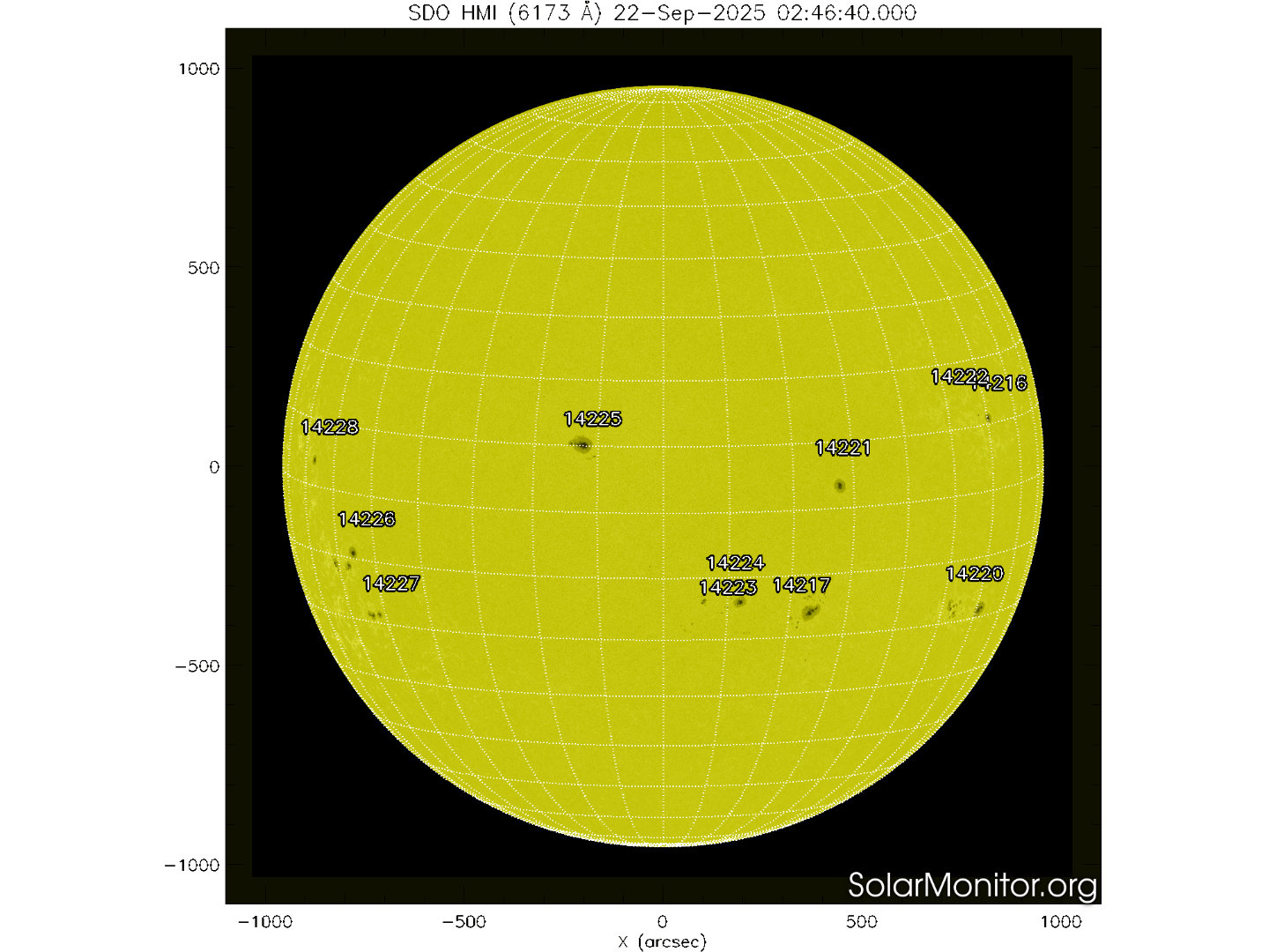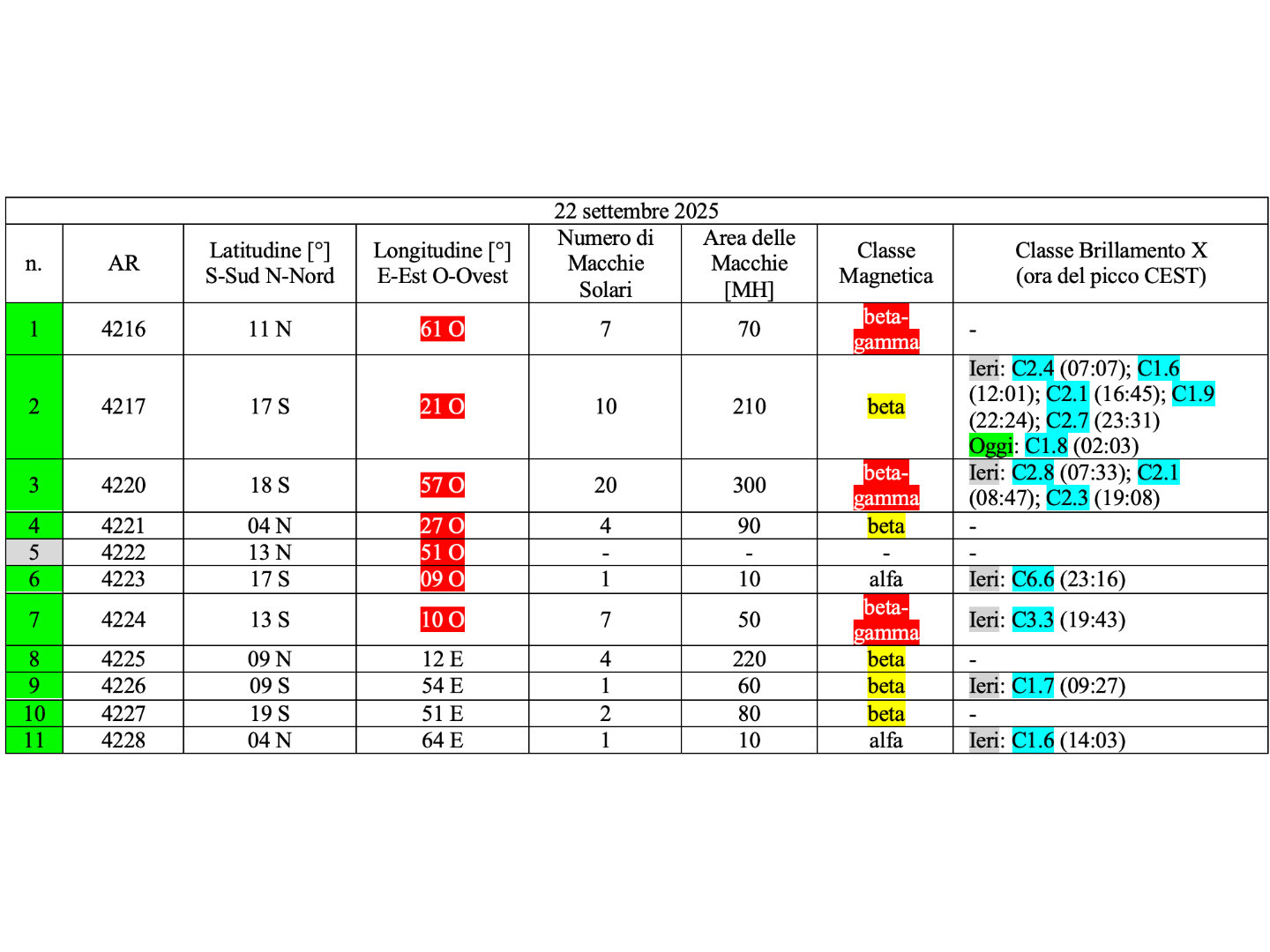 Undici regioni attive sono presenti in fotosfera oggi 22 settembre 2025, 10 con macchie solari e 1 priva di macchie.