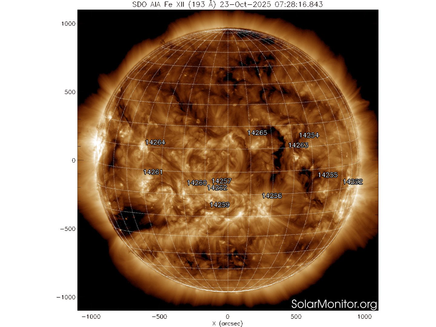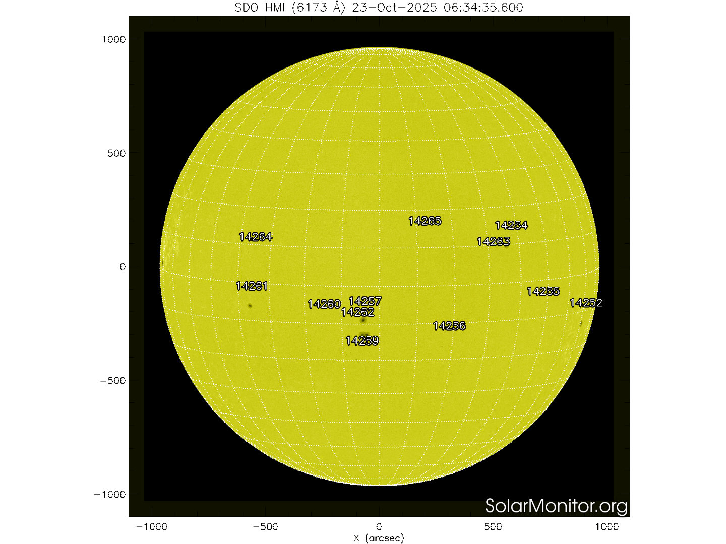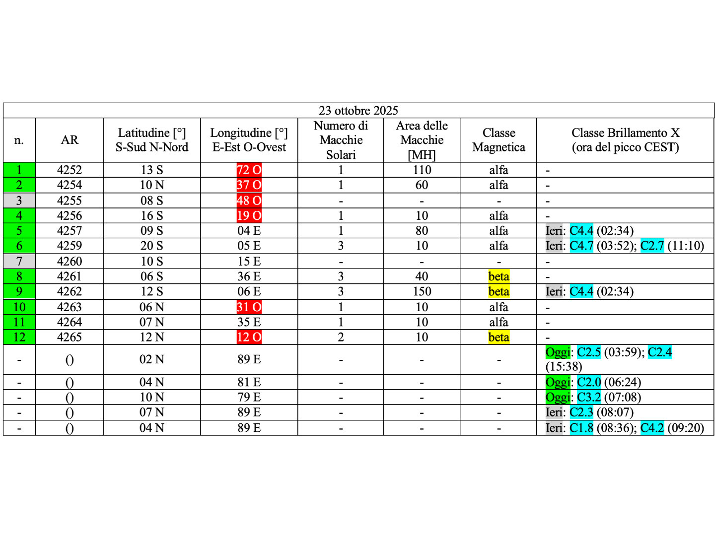 Dodici regioni attive sono presenti in fotosfera oggi 23 ottobre 2025, di cui 10 con macchie solari e 2 prive di macchie.