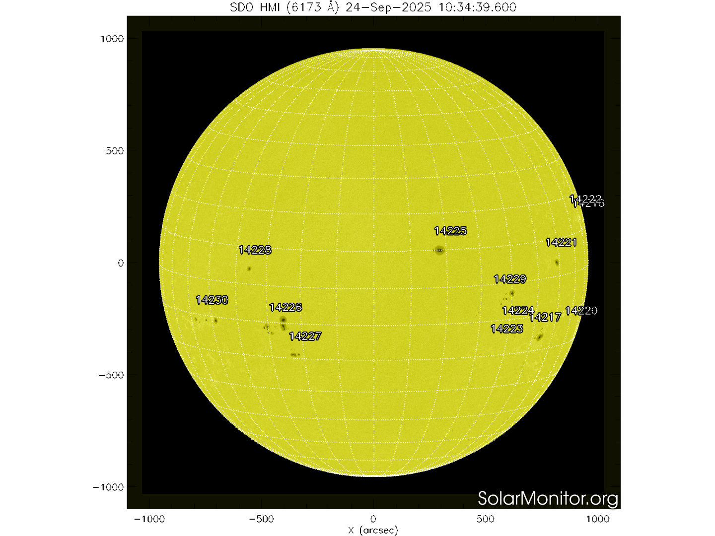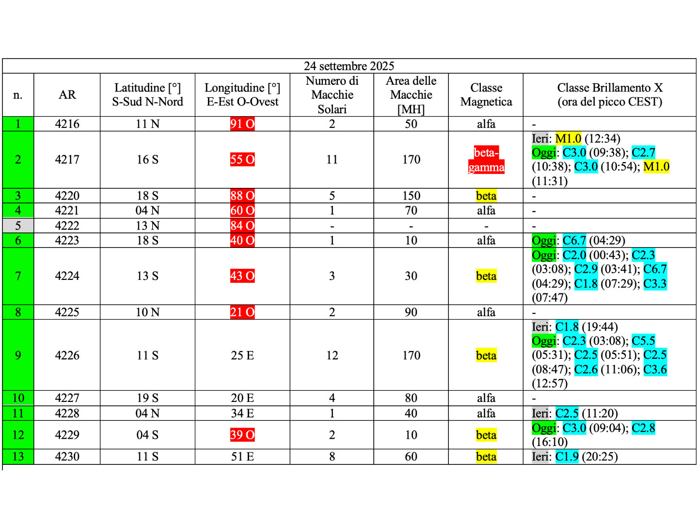 Tredici regioni attive sono presenti in fotosfera oggi 24 settembre 2025, 12 con macchie solari e 1 priva di macchie.