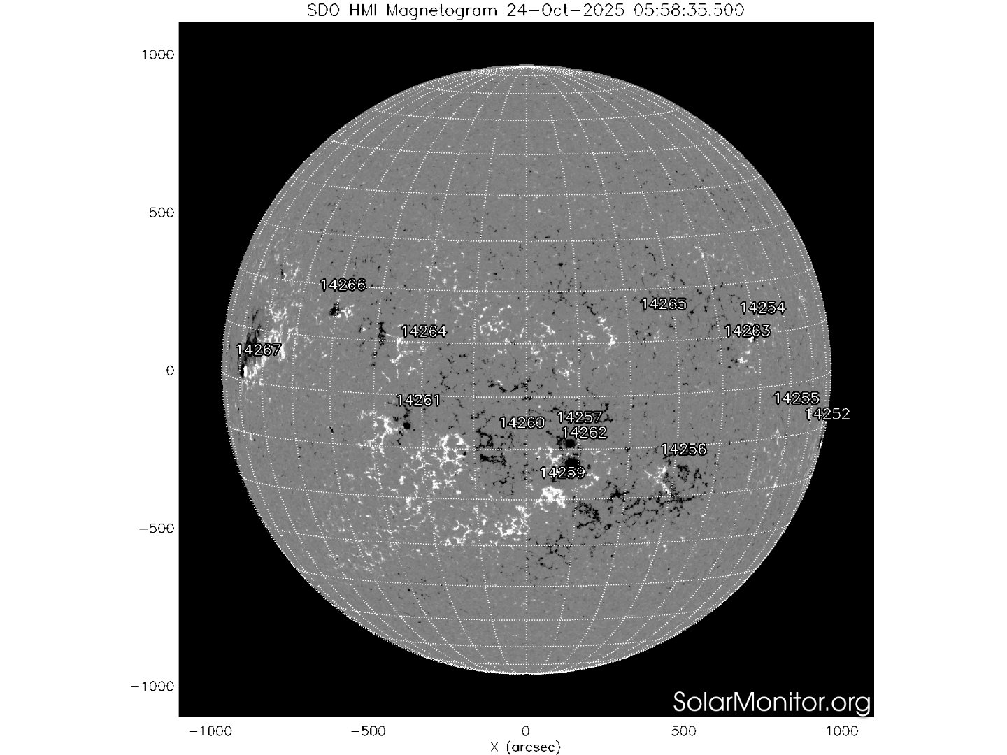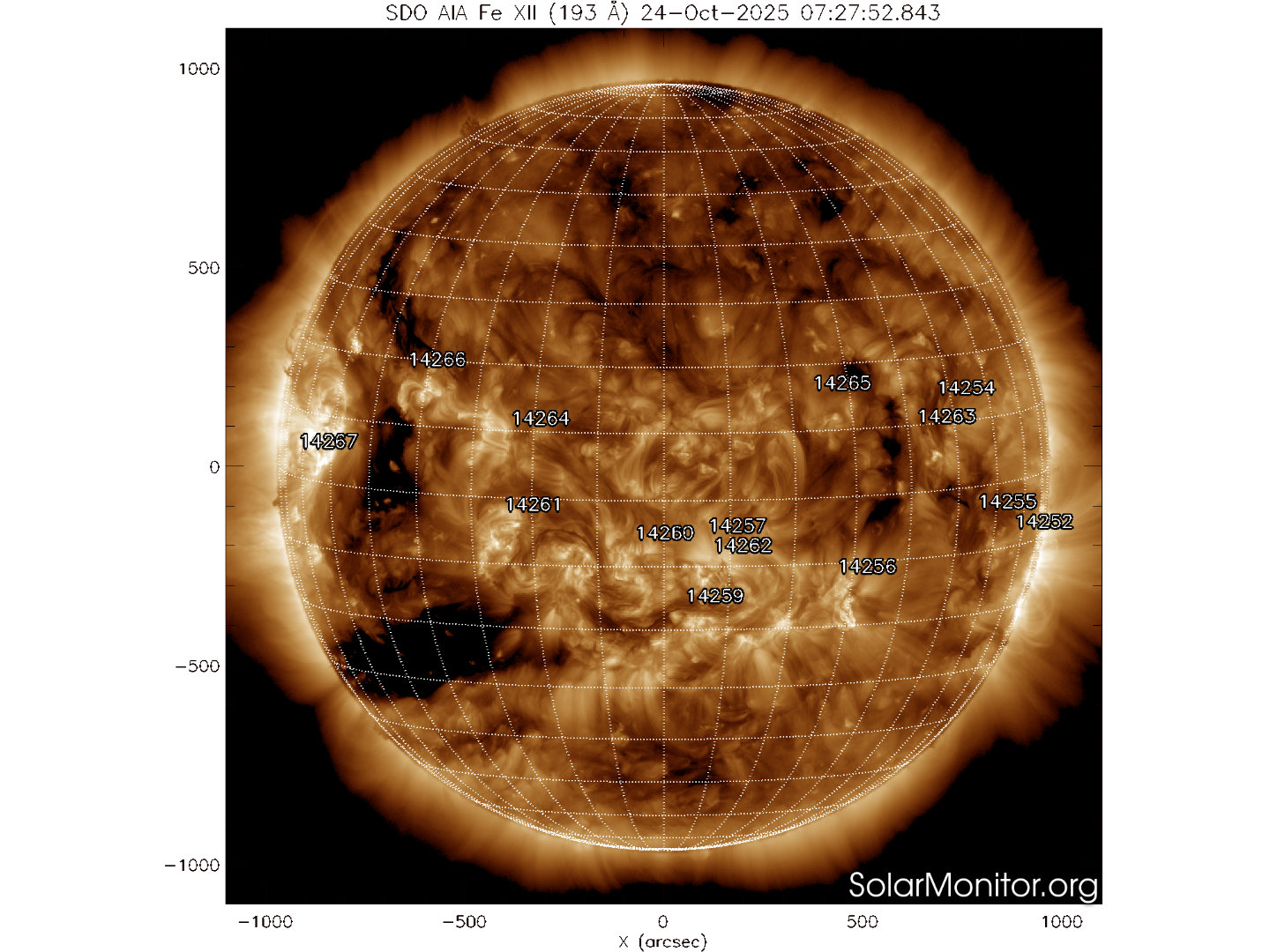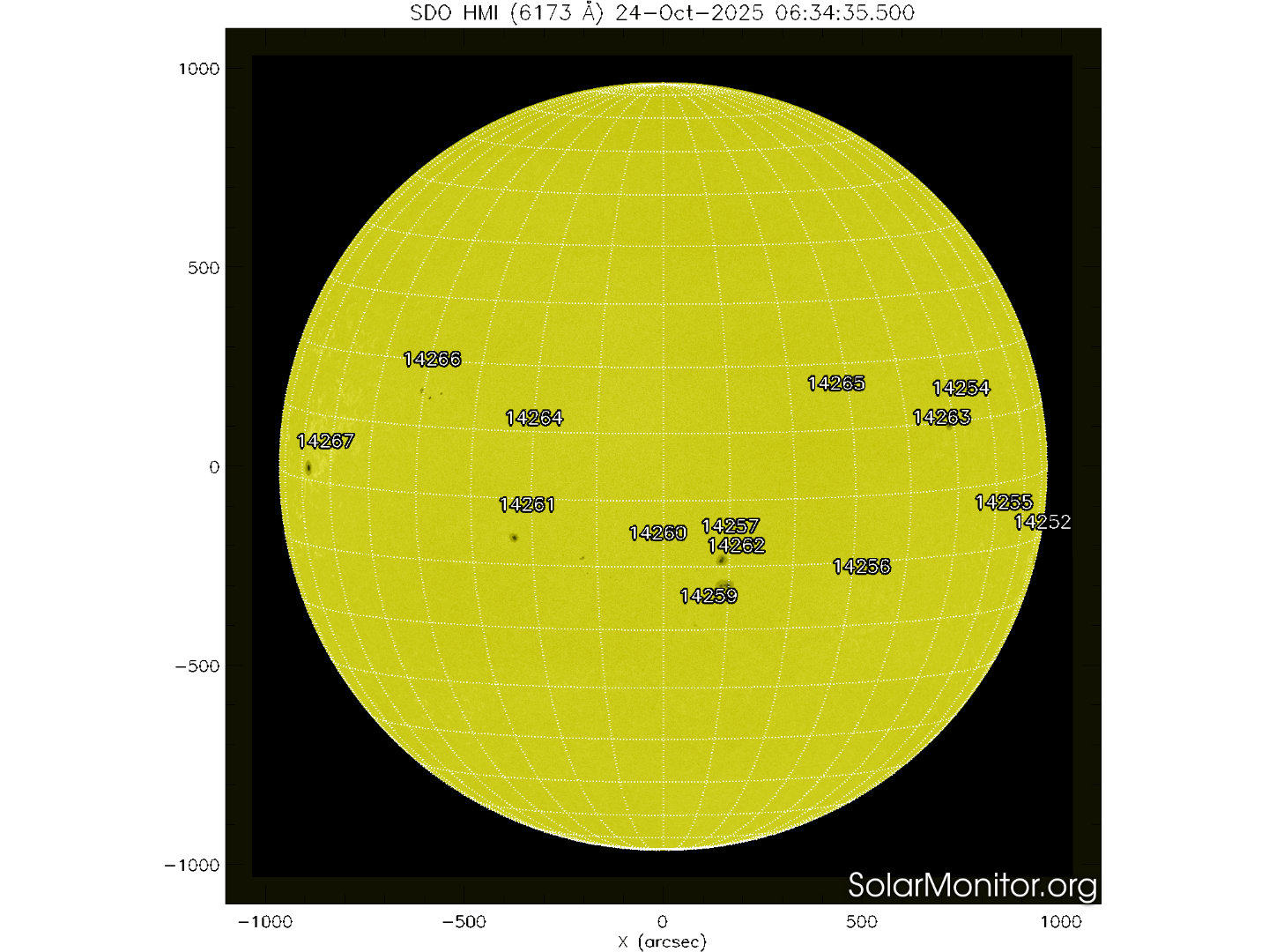 Quattordici regioni attive sono presenti in fotosfera oggi 24 ottobre 2025, di cui 19 con macchie solari e 6 prive di macchie.