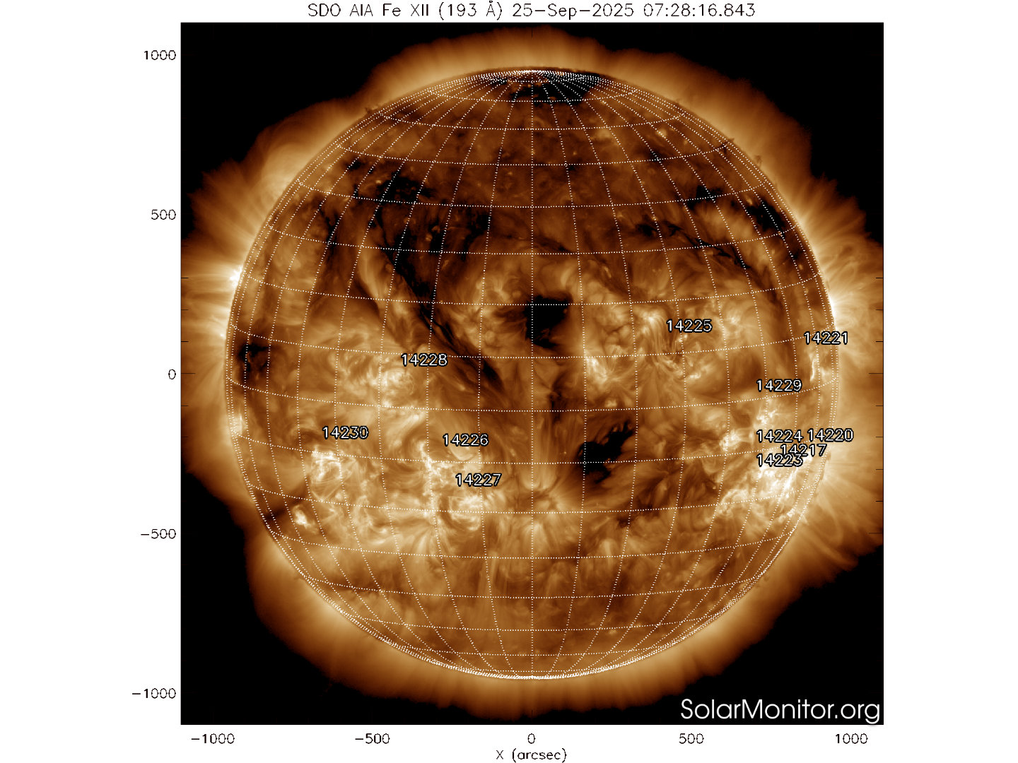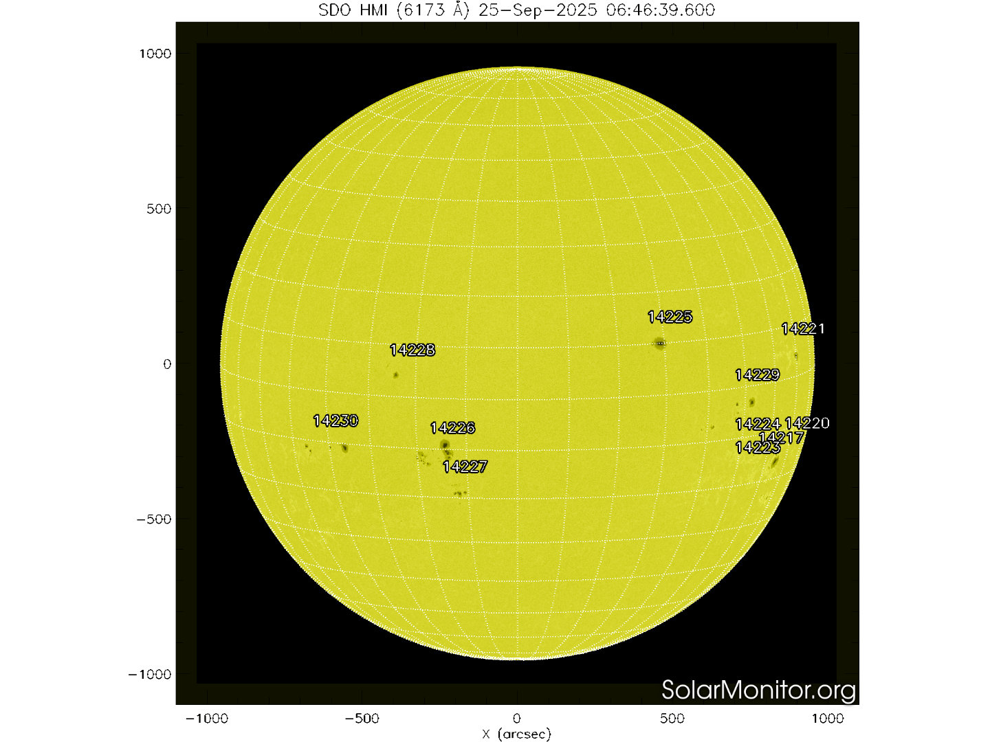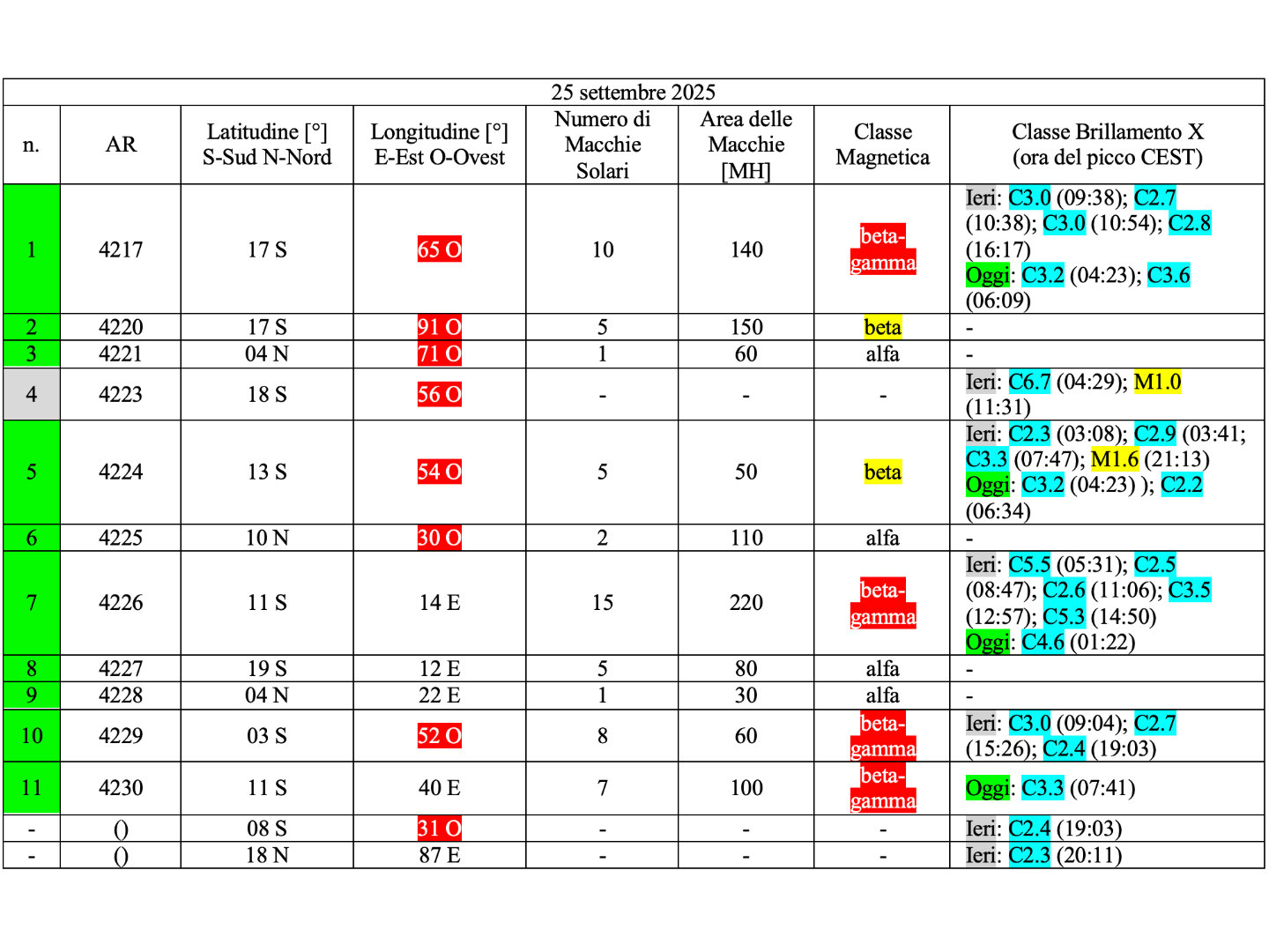 Undici regioni attive sono presenti in fotosfera oggi 25 settembre 2025, di cui 10 con macchie solari e 1 priva di macchie.