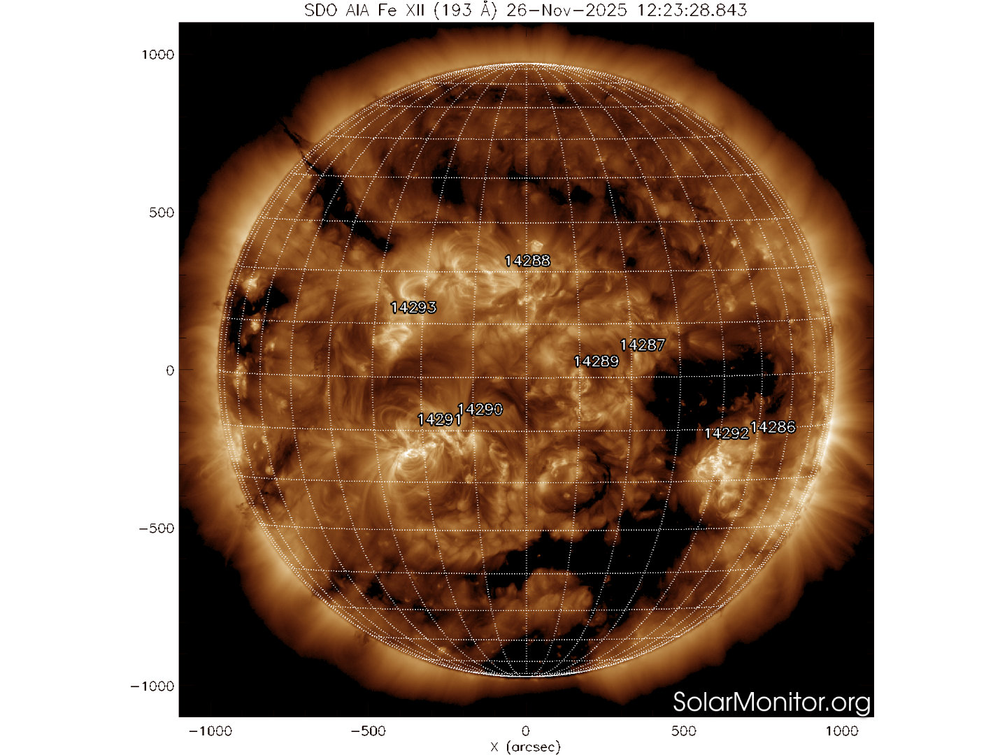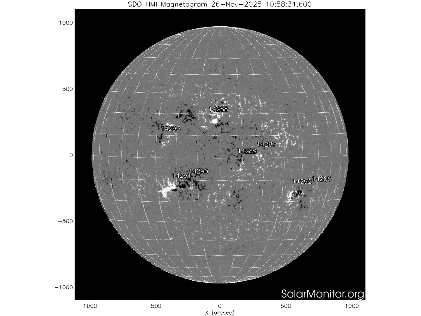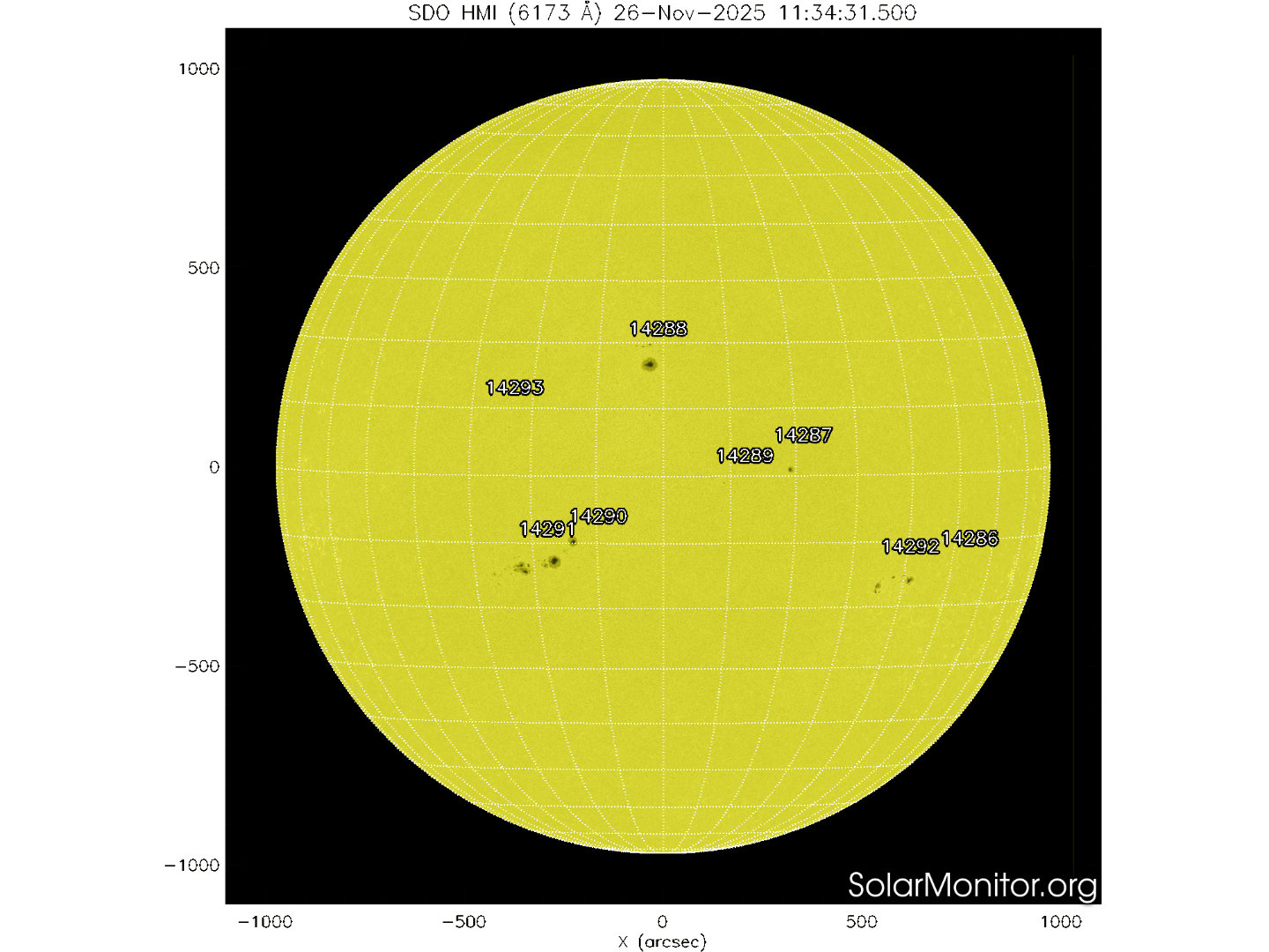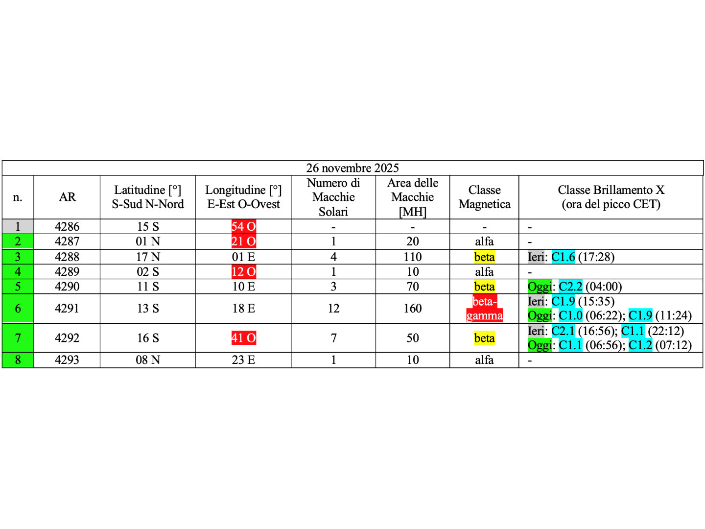 Otto regioni attive sono presenti in fotosfera oggi 26 novembre 2025, di cui 7 con macchie solari e 1 priva di macchie.