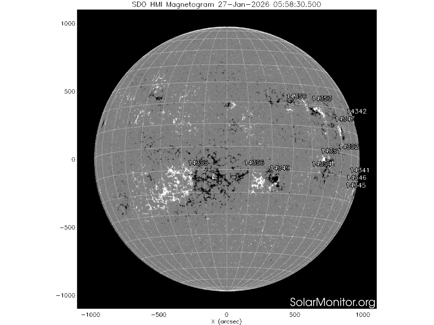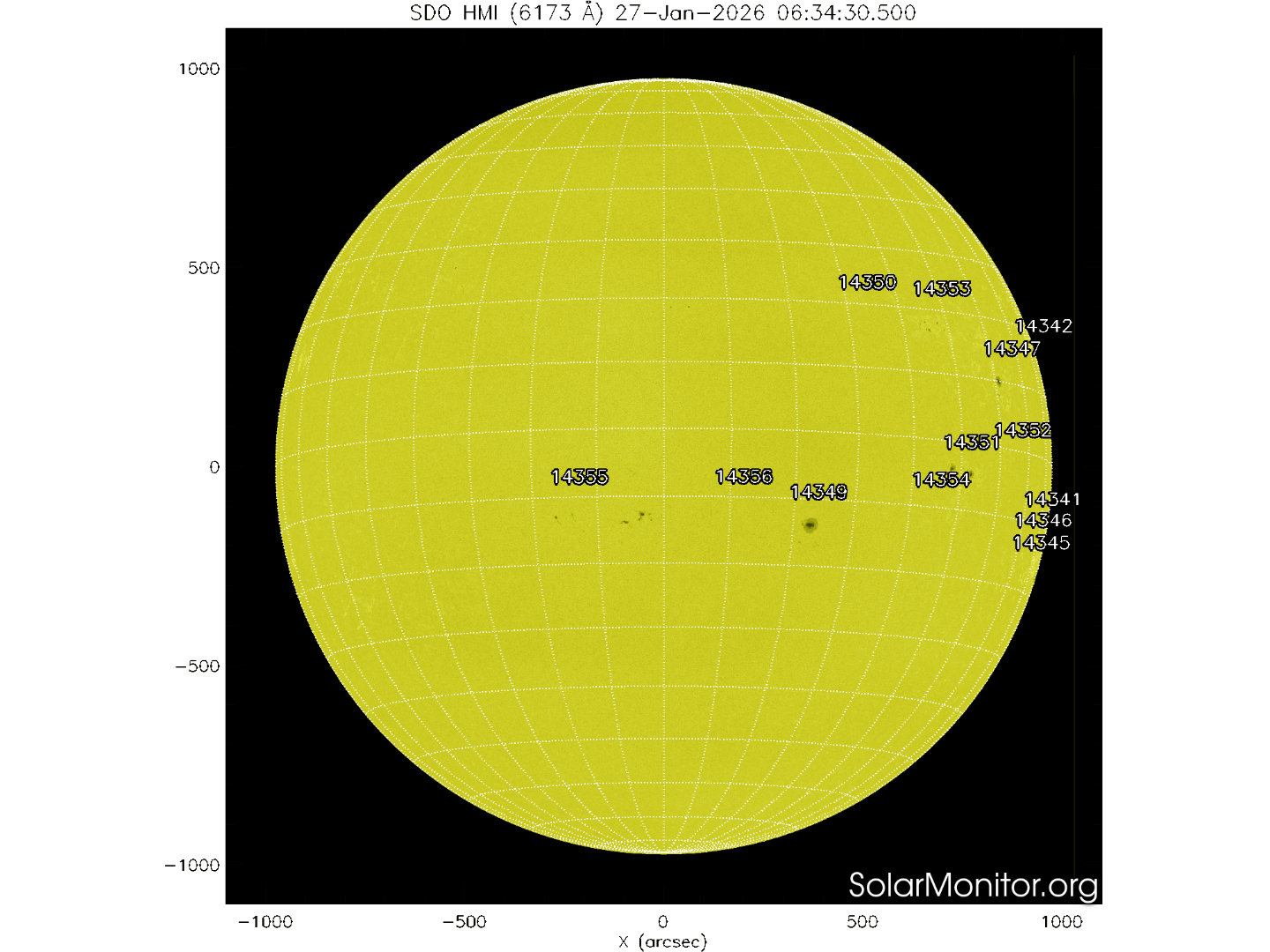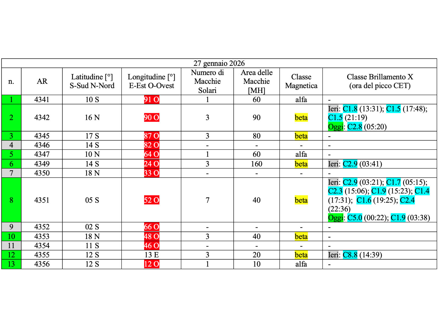 Tredici regioni attive sono presenti in fotosfera oggi 27 gennaio 2026, di cui 9 con macchie solari e 4 prive di macchie.