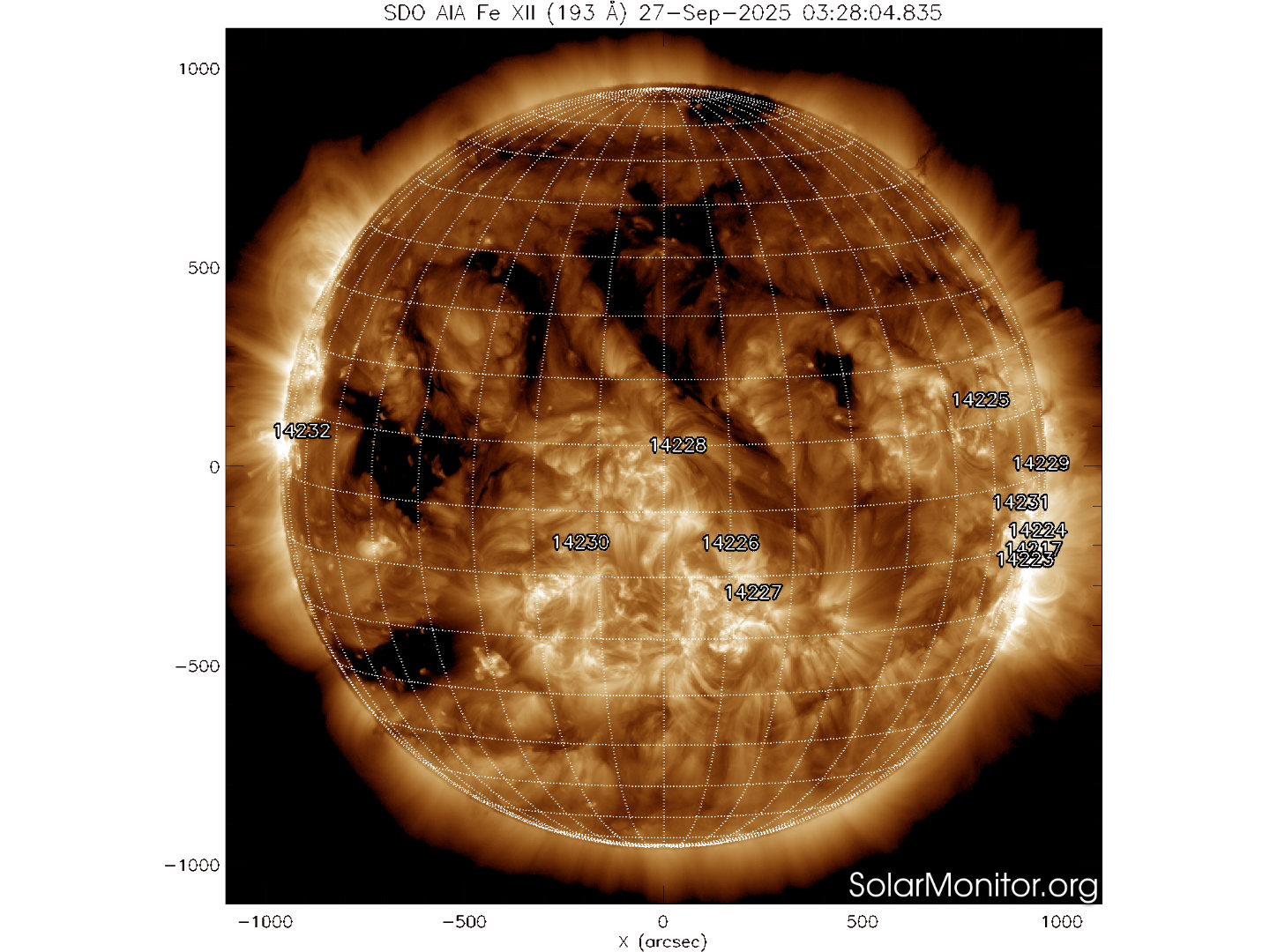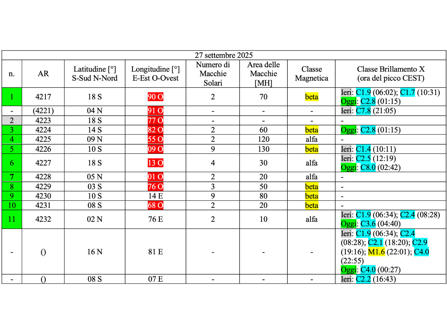 Undici regioni attive sono presenti in fotosfera oggi 27 settembre 2025, di cui 10 con macchie solari e 1 priva di macchie.