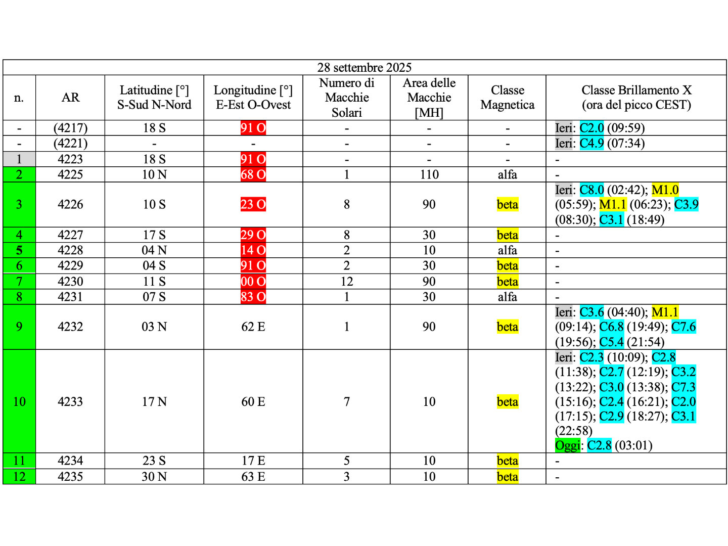 Dodici regioni attive sono presenti in fotosfera oggi 28 settembre 2025, di cui 11 con macchie solari e 1 priva di macchie.