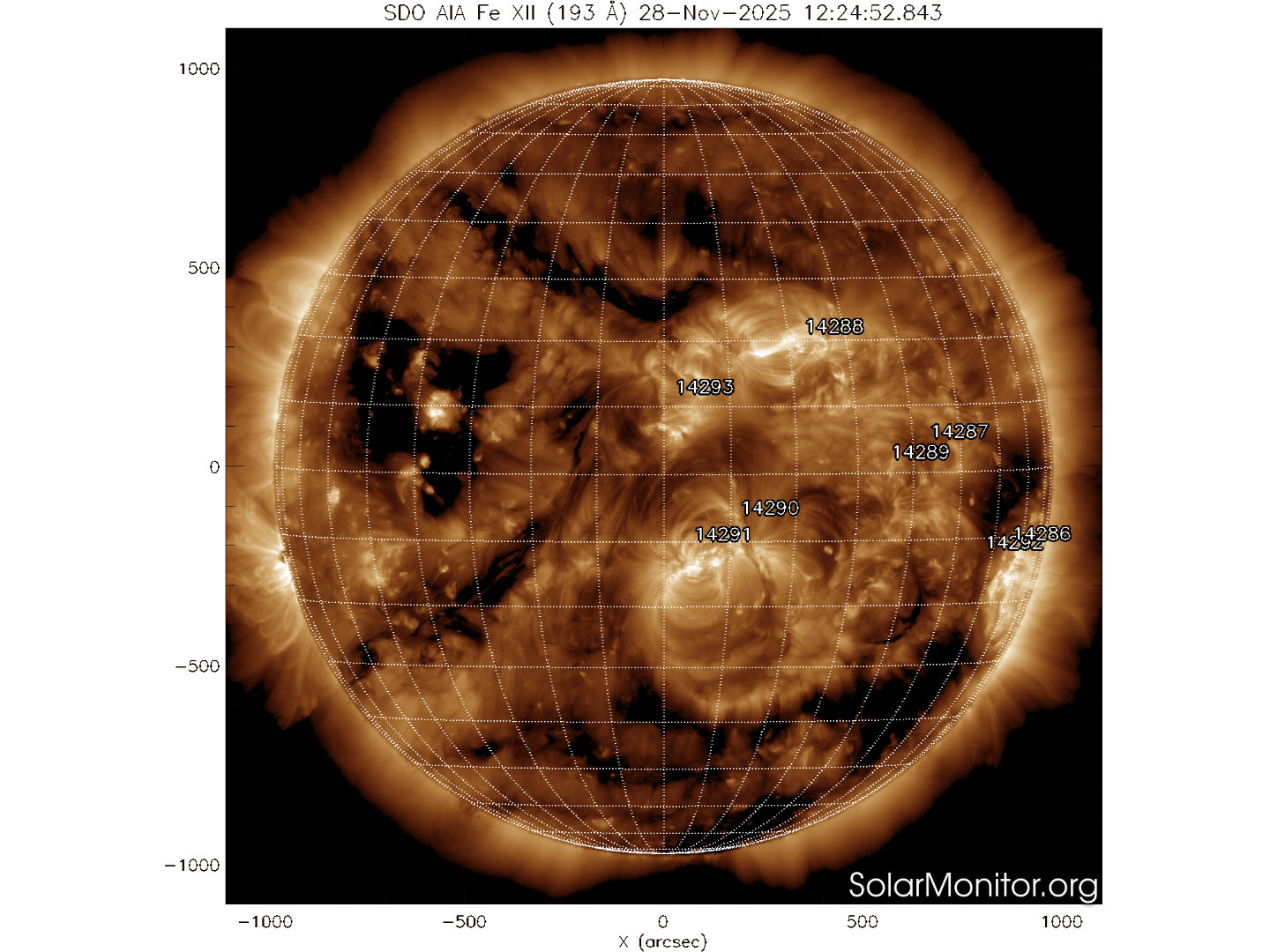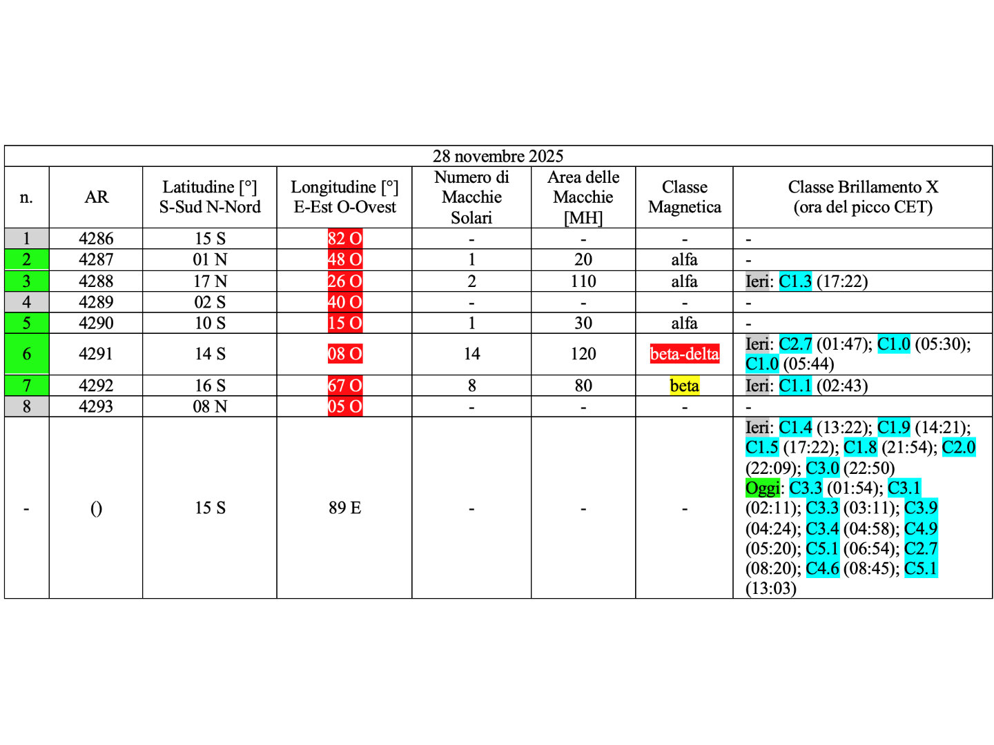Otto regioni attive sono presenti in fotosfera oggi 28 novembre 2025, di cui 5 con macchie solari e 3 prive di macchie.