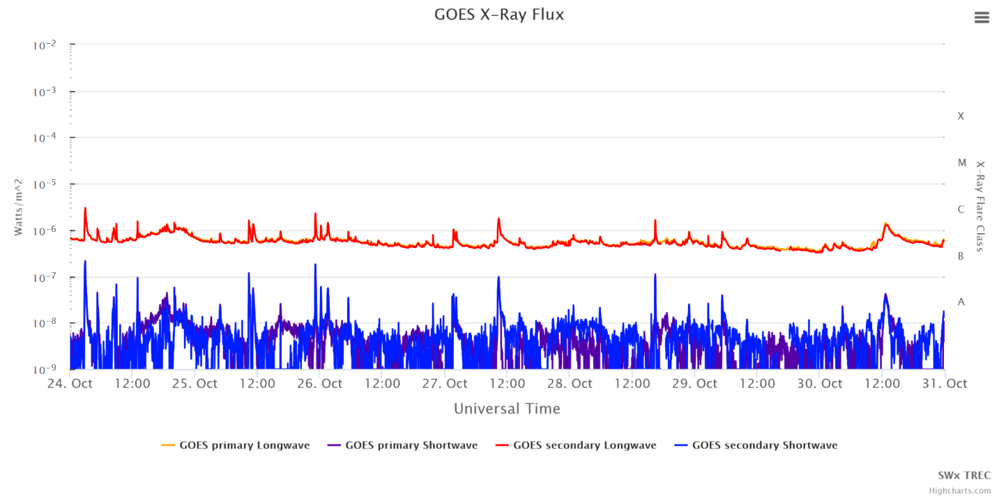 Possiamo allora esaminare anche il flusso di raggi X misurato dal satellite GOES, nello stesso periodo dal 24 al 30 ottobre. Anche in questo caso l’attività solare è rimasta estremamente tranquilla: nessun brillamento di classe X ed M, soltanto alcuni di classe C, praticamente irrilevanti. Questo quadro è confermato anche dal sito web SolarMonitor. Guarda la figura con l’andamento del flusso di raggi X energetici dal 24 al 30 ottobre © Regents dell’Università del Colorado 2025.