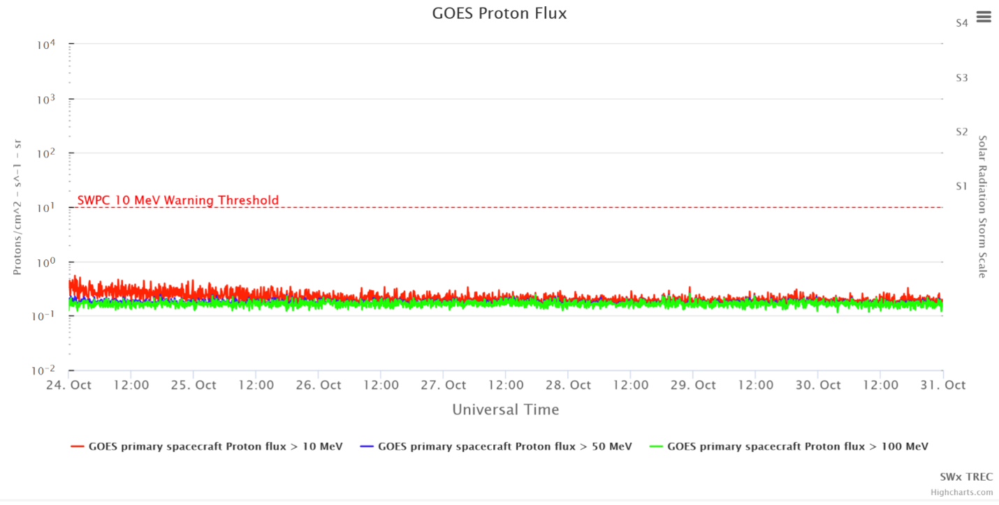 Guarda la figura con l’andamento del flusso di protoni energetici dal 24 al 30 ottobre © Regents dell’Università del Colorado 2025.